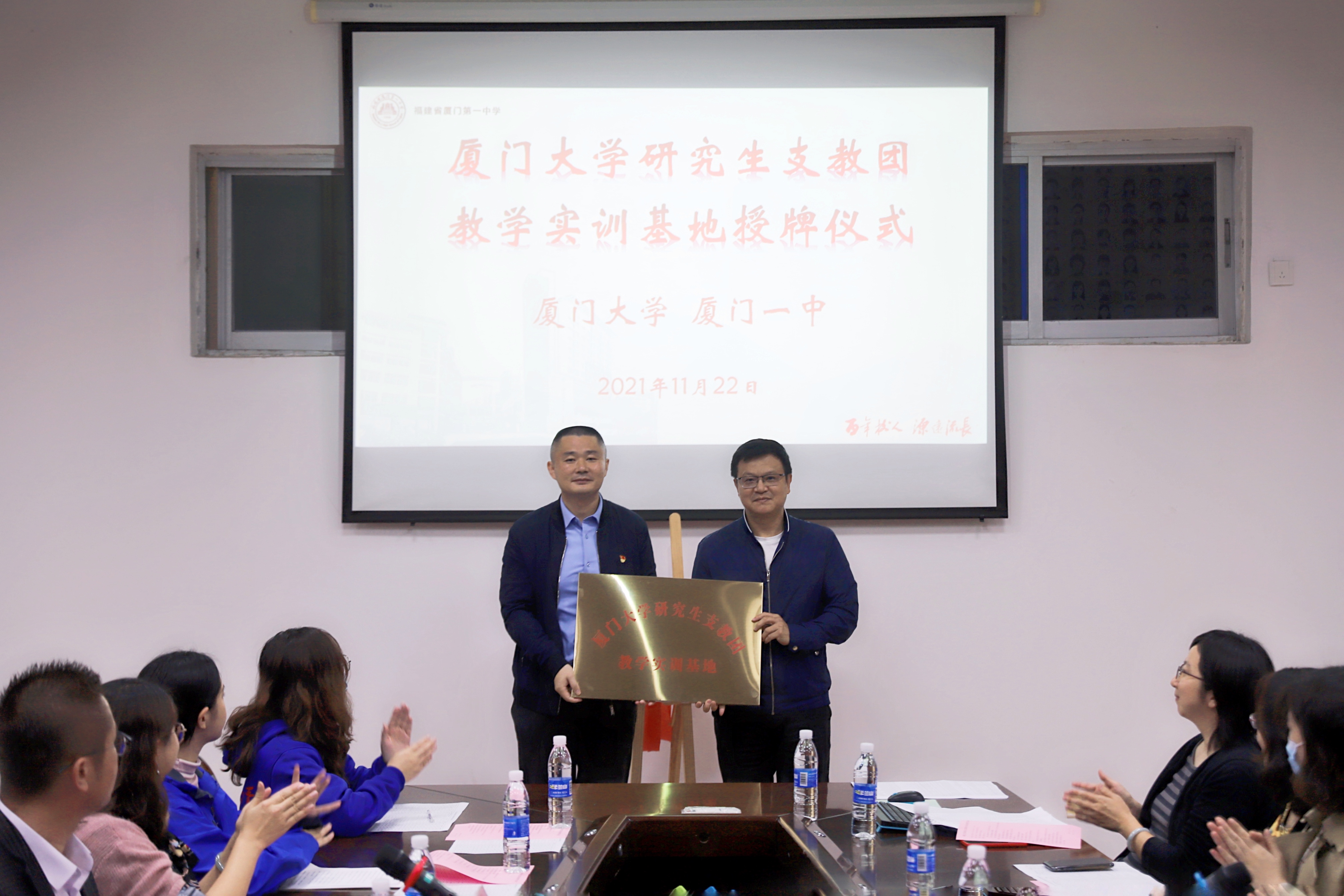 11月22日下午,厦门大学研究生支教团教学实习基地授牌仪式在厦门一中初中部举行。厦门一中党委副书记张南峰、团委书记姜博及全体支教团指导老师,我校团委书记曾铮、团委副书记梁振伟、团委兼职副书记林宇阳、团委组织部主任王心君和第24届研究生支教团全体成员参加授牌仪式。仪式由厦门一中教务处副主任邓衍生主持。
