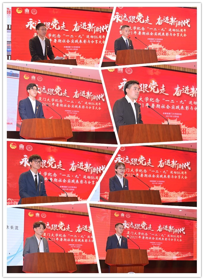 随后“自强”新青年暑期社会实践队、“石榴籽山海情”暑期社会实践队、“学‘四史’促融合”两岸博士生地方经济发展服务团、“逐梦远航”暑期社会实践队、“北上拥湾”暑期社会实践队、“艺术团文艺三下乡”暑期社会实践队、“闽江源河小禹”暑期社会实践队、“囊萤星火讲师团”暑期社会实践队依次上台分享了他们在实践过程中的感人事迹与心得体会,展示了实践队员们如何努力践行“用脚步丈量祖国大地,用青春书写家国情怀”。