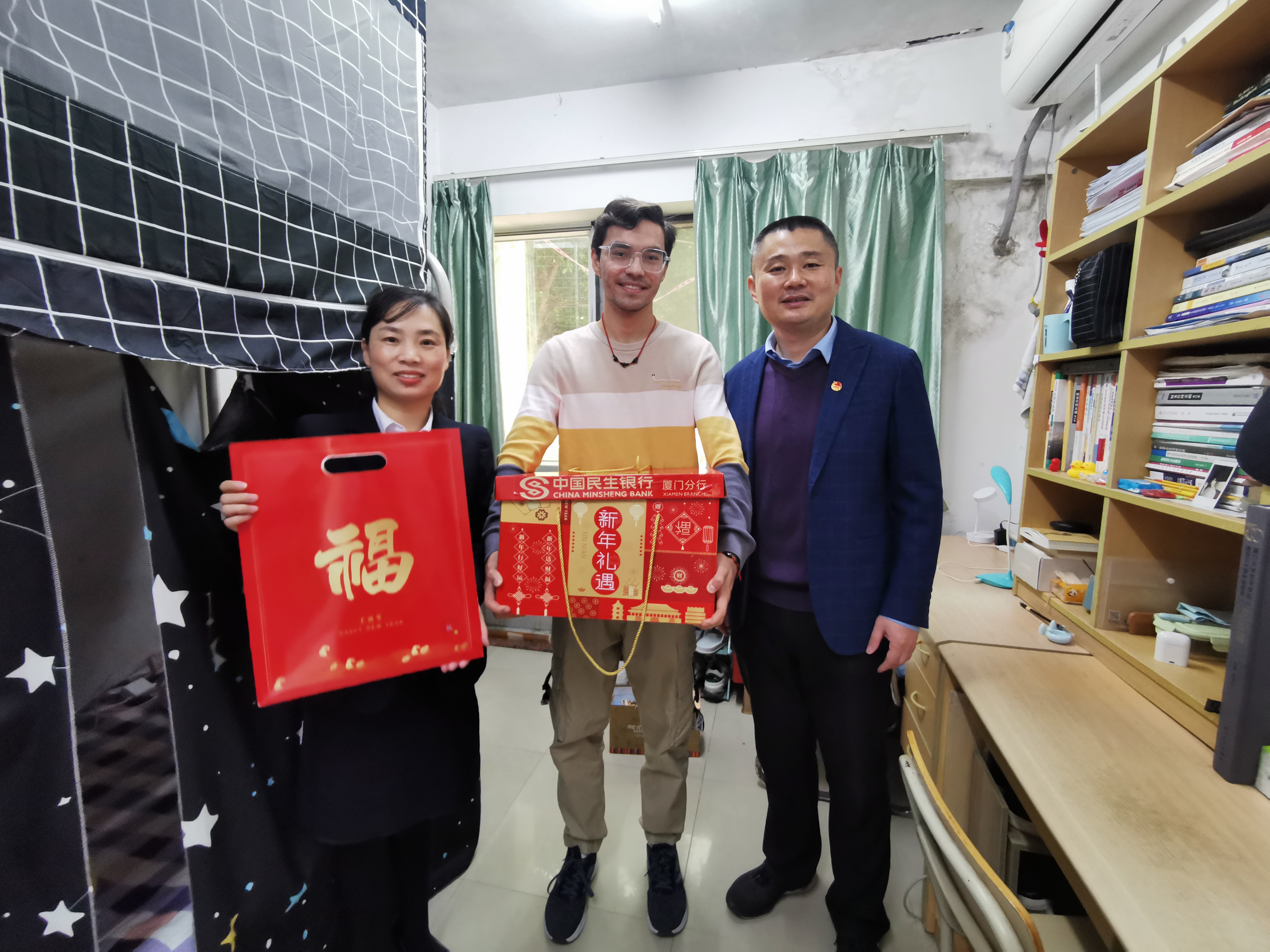 此次慰问,校团委与厦门团市委、中国民生银行厦门分行团委为同学们精心准备了慰问品、防疫物资套装和春联。校团委书记曾铮和中国民生银行厦门分行团委书记张小珊与同学们畅聊并表示,共青团永远是大家坚强有力的“大后方”,留校期间如有任何困难都可以跟团委老师提出。