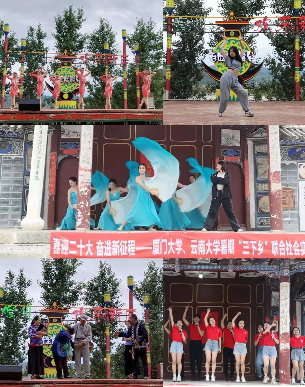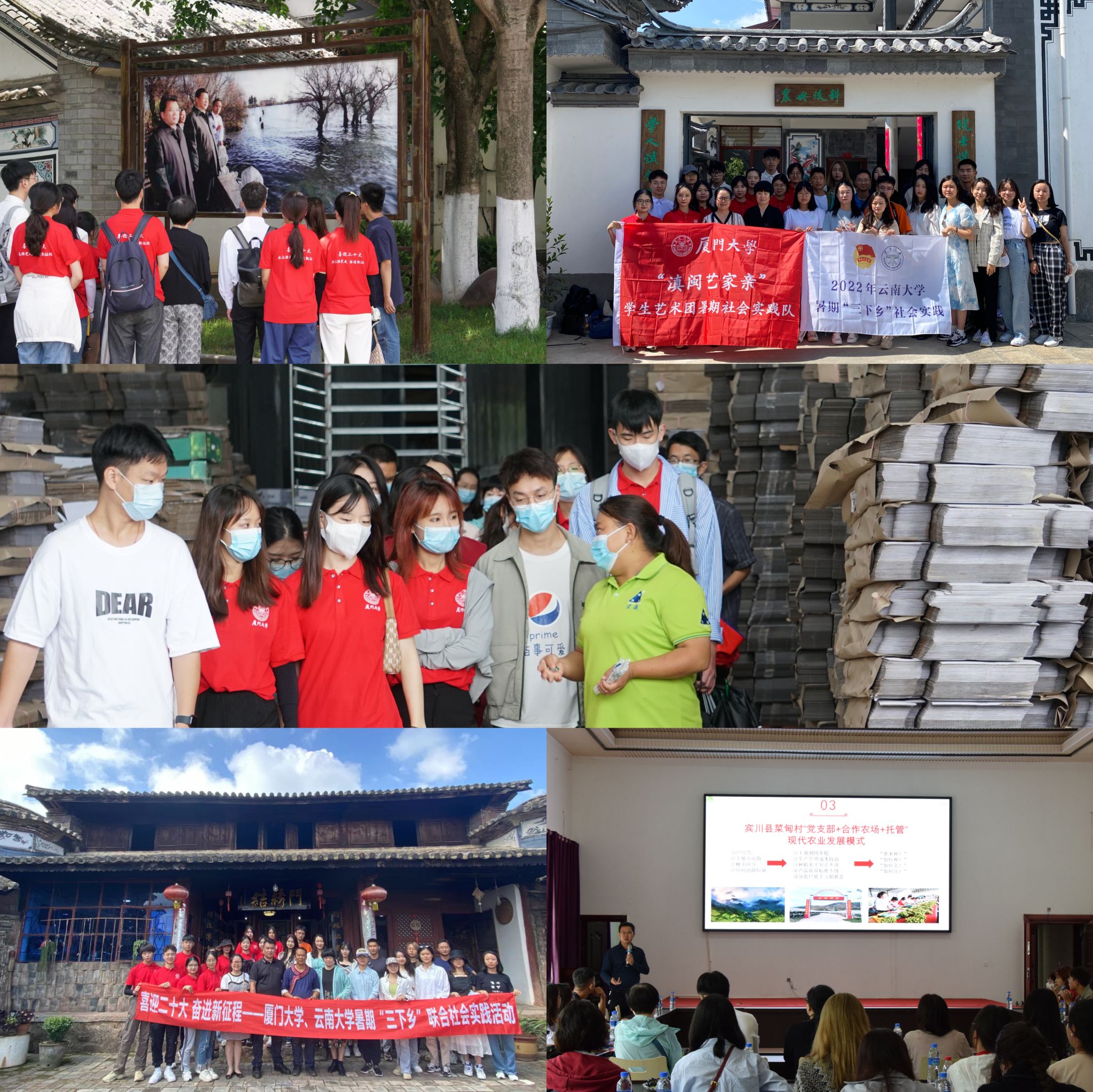7月28日至8月3日,厦门大学学生艺术团“滇闽艺家亲”暑期社会实践队与云南大学“红云向党、艺绘党心”暑期社会实践队共赴云南昆明、大理,联合开展“喜迎二十大 奋进新征程”暑期“三下乡”社会实践活动。两校实践队追随习近平总书记的足迹开展参访学习,祭抗日先烈、忆红军长征,探生态保护、谋乡村振兴,并为大理州湾桥镇古生村和乔甸镇海稍新庄红军村送去了青春洋溢的惠民文艺演出。
