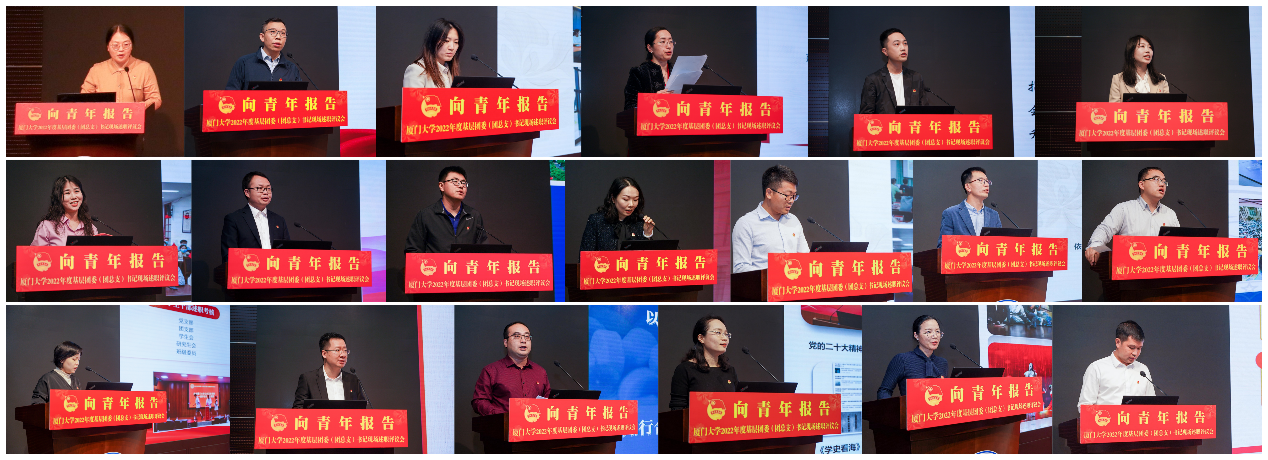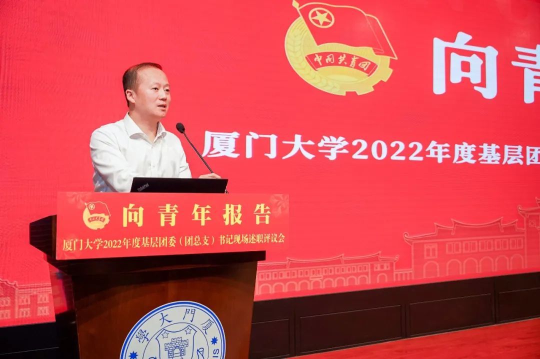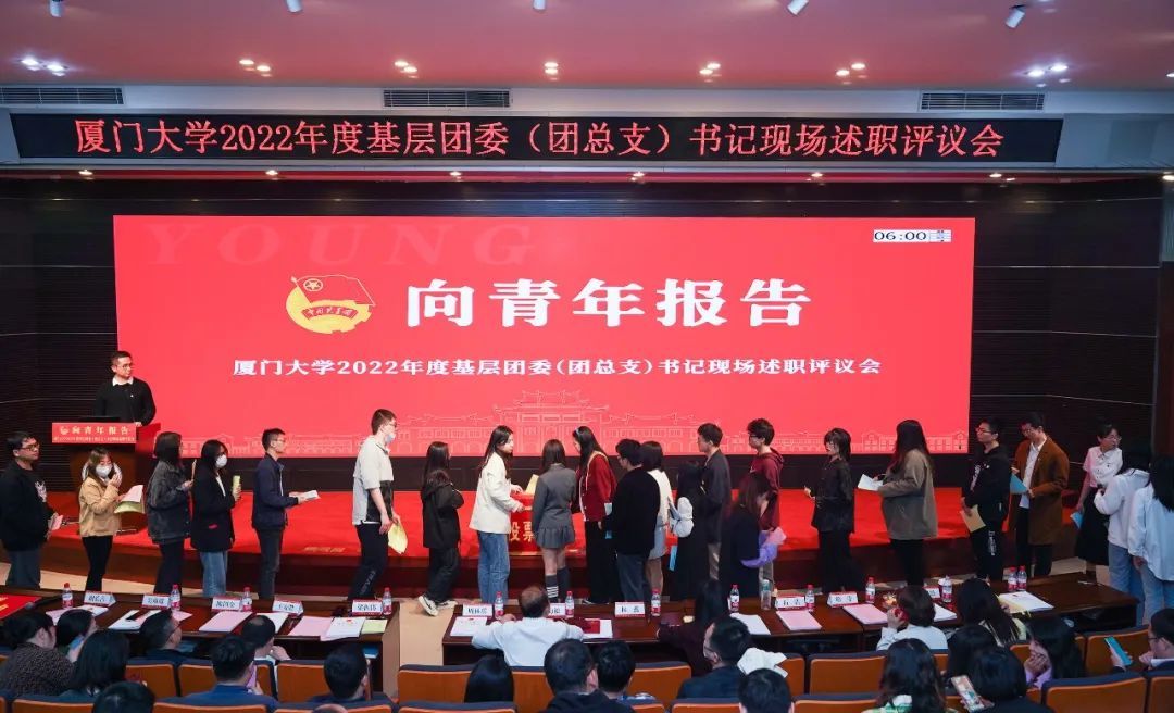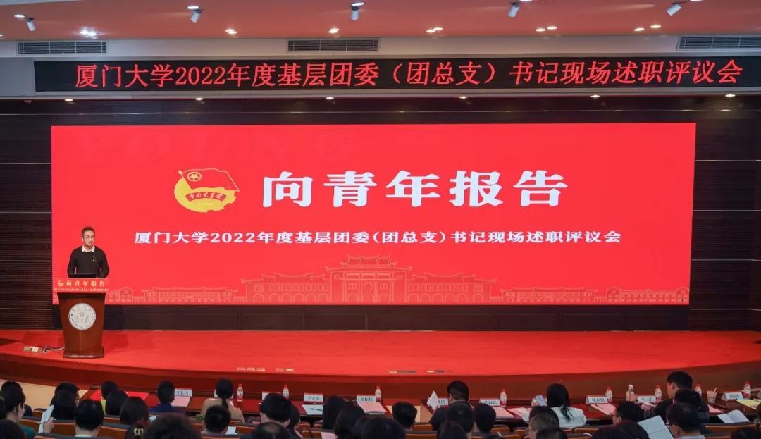 3月21日下午,厦门大学2022年度基层团委(团总支)书记述职评议会在经济学院N402报告厅召开。会议深入学习宣传贯彻党的二十大精神,贯彻落实全面从严治团、从严管理团干部要求,认真落实团省委关于集中开展基层团组织书记述职评议考核的工作要求,坚持“大抓基层”鲜明导向,全面梳理学校基层团组织2022年取得的成绩,总结经验、互学互鉴、谋划未来,不断提升我校基层团组织建设的整体水平。会议由校团委副书记梁振伟主持。