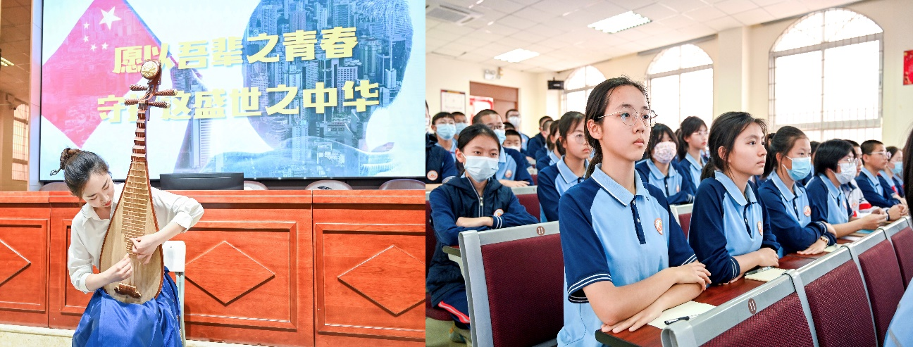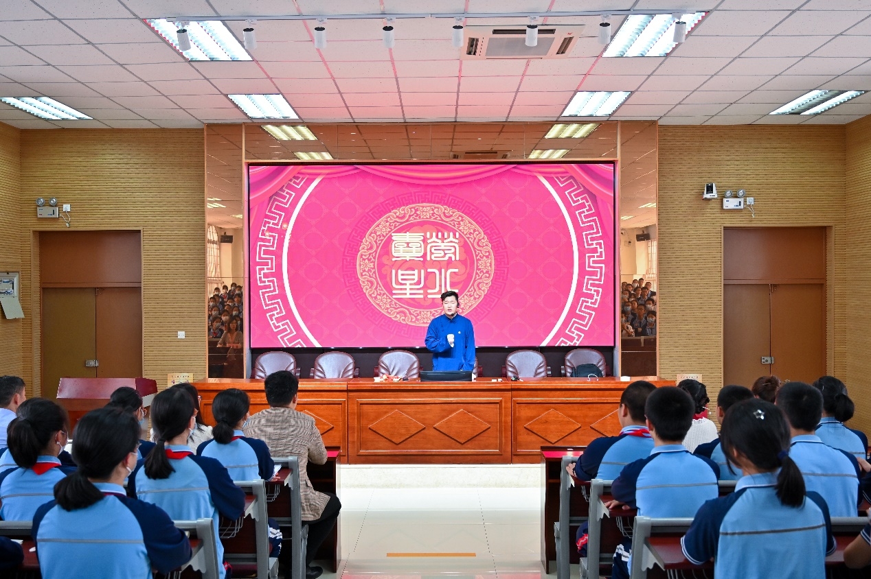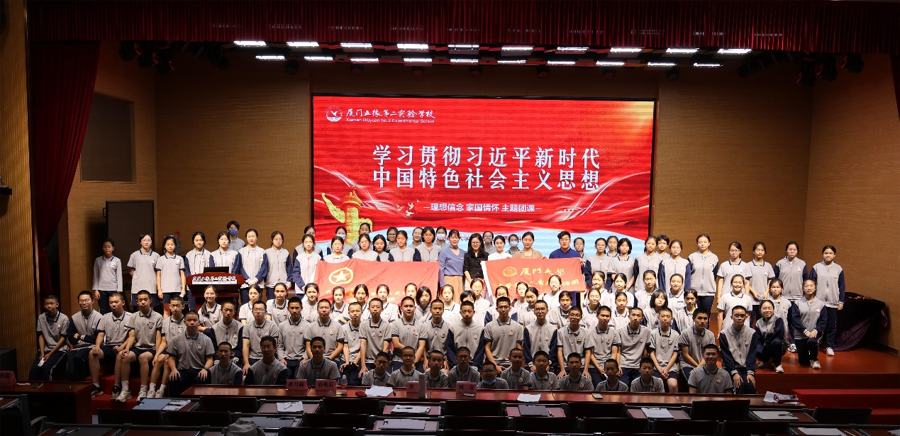 在厦门五缘第二实验学校, “竹板这么一打,别的咱不夸,夸一夸嘉庚先生到延安了。”竹板一打、马褂一穿,讲师团的商兆岩用说书、快板、魔术等相结合的形式,把厦大“嘉庚精神”娓娓道来,走“新”更走“心”。特别的演绎方式吸引在场的很多中学生;“将来的某一天,我希望能够实现自己外交官的梦想,在世界舞台上展示中国的形象。我很庆幸,自己小小的梦想能在大国崛起的时代背景中不断壮大,而每一个不同的我们,在盛世之下,都肩负着相同的使命和重任——为实现中华民族伟大复兴贡献自己的一份力量。”“五四青年节出生的我,带着与生俱来的青年属性,会同所有的中国青年一道,满怀青春热忱,驻守粮食安全,努力成为国际粮食体系的推动者和建设者,更好地为全球粮食安全作出中国贡献。”讲师团成员龚晓和潘月涵,结合自身的学习和科研经历,分别从小切口讲“活”了中国外交的“斗争精神”和守护大国粮仓的重要性,让中学生能够真正“听得懂、记得住”。会后,厦门五缘第二实验学校八年3班的徐嘉彧激动地表示:“这场主题团课太特别啦,好有意思,从大国外交到嘉庚精神,再到袁隆平爷爷的杂交水稻,厦门大学的哥哥姐姐们站在他们的专业角度带我们看现在的中国、看当今的世界,让我受益匪浅。小到餐餐光盘珍惜粮食,大到励志学习报效祖国,作为青年一代的我们理应感谢前辈的付出,并接过他们手中的接力棒,为实现中华民族伟大复兴而努力奋斗。”