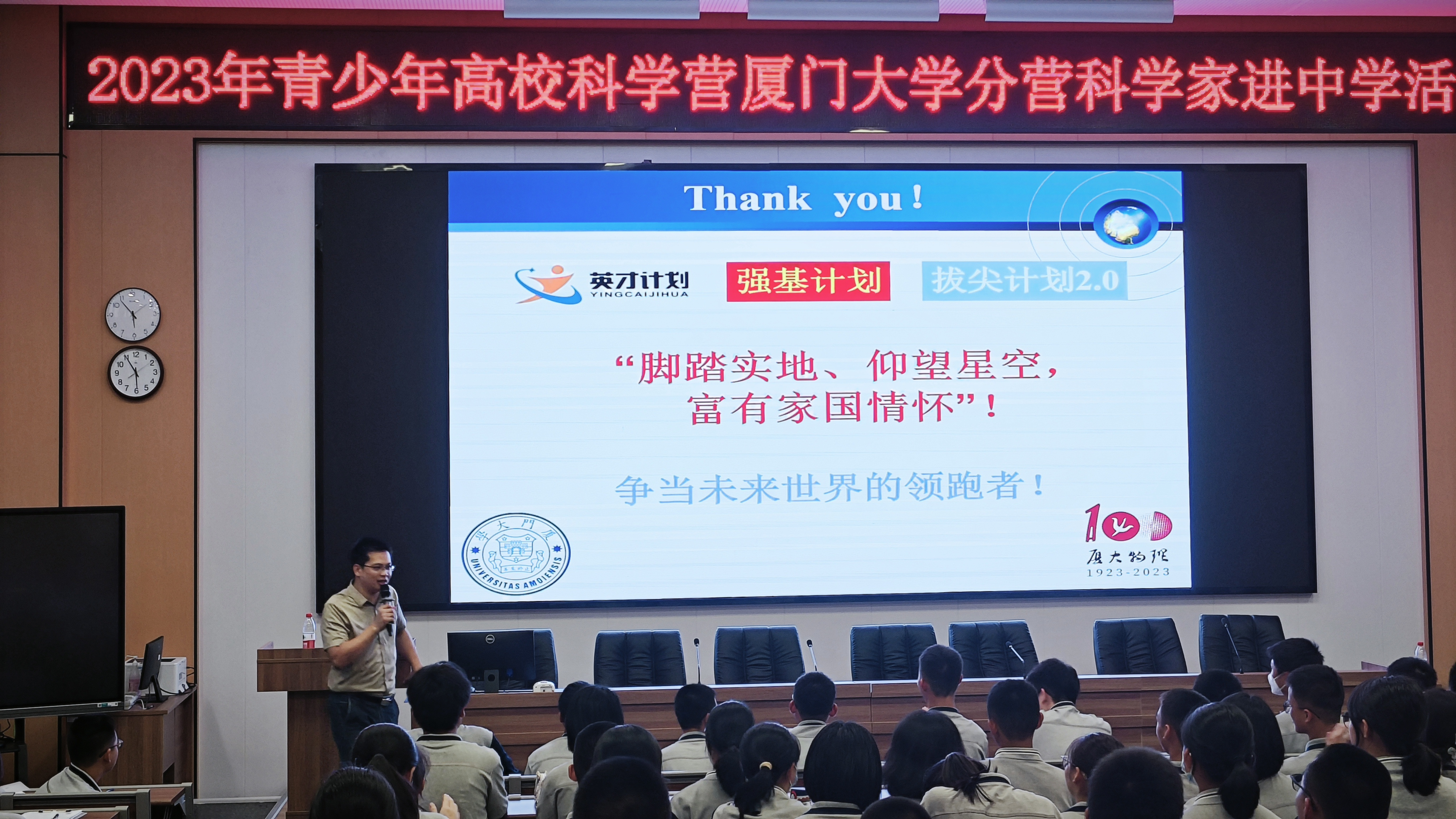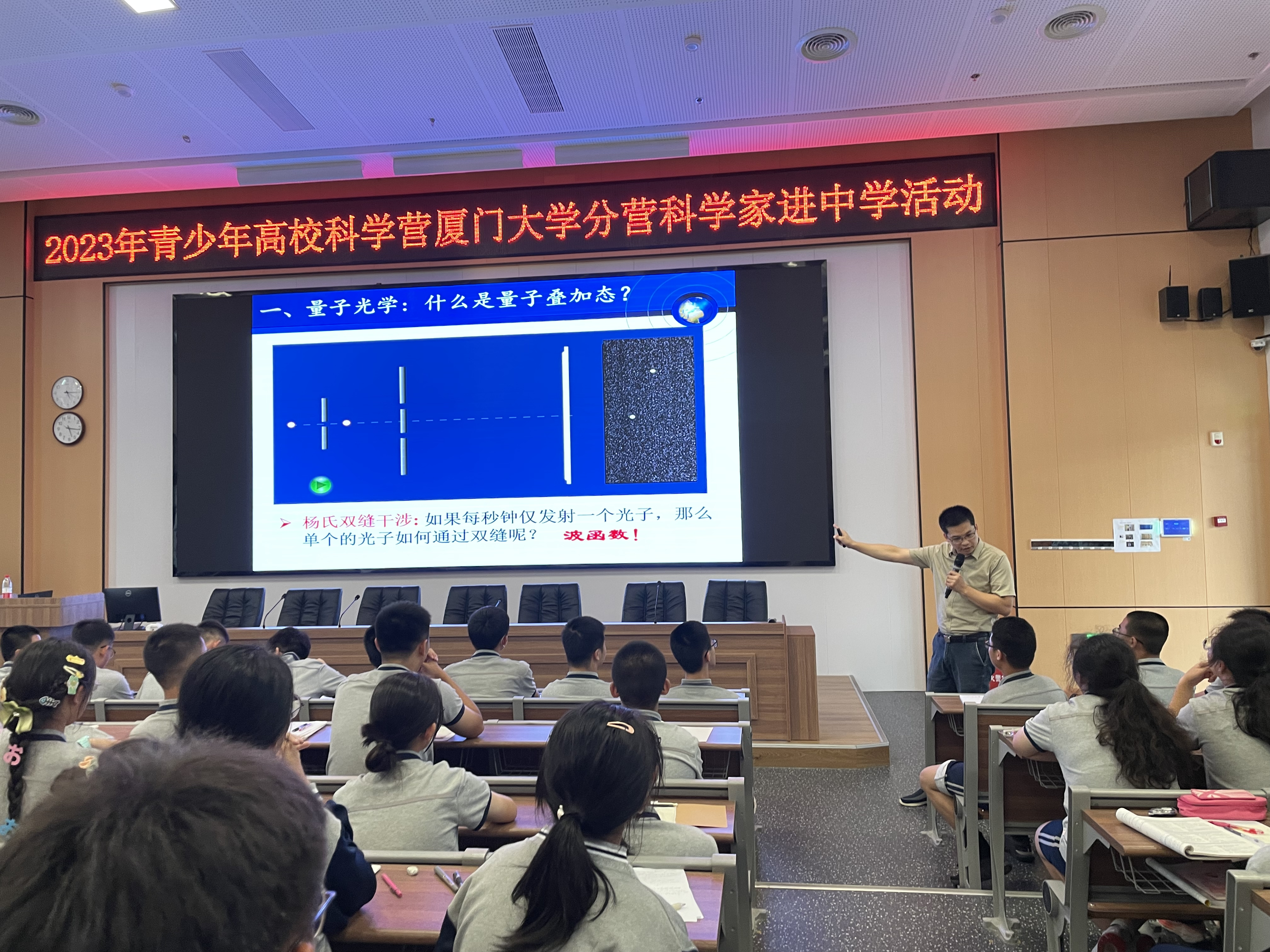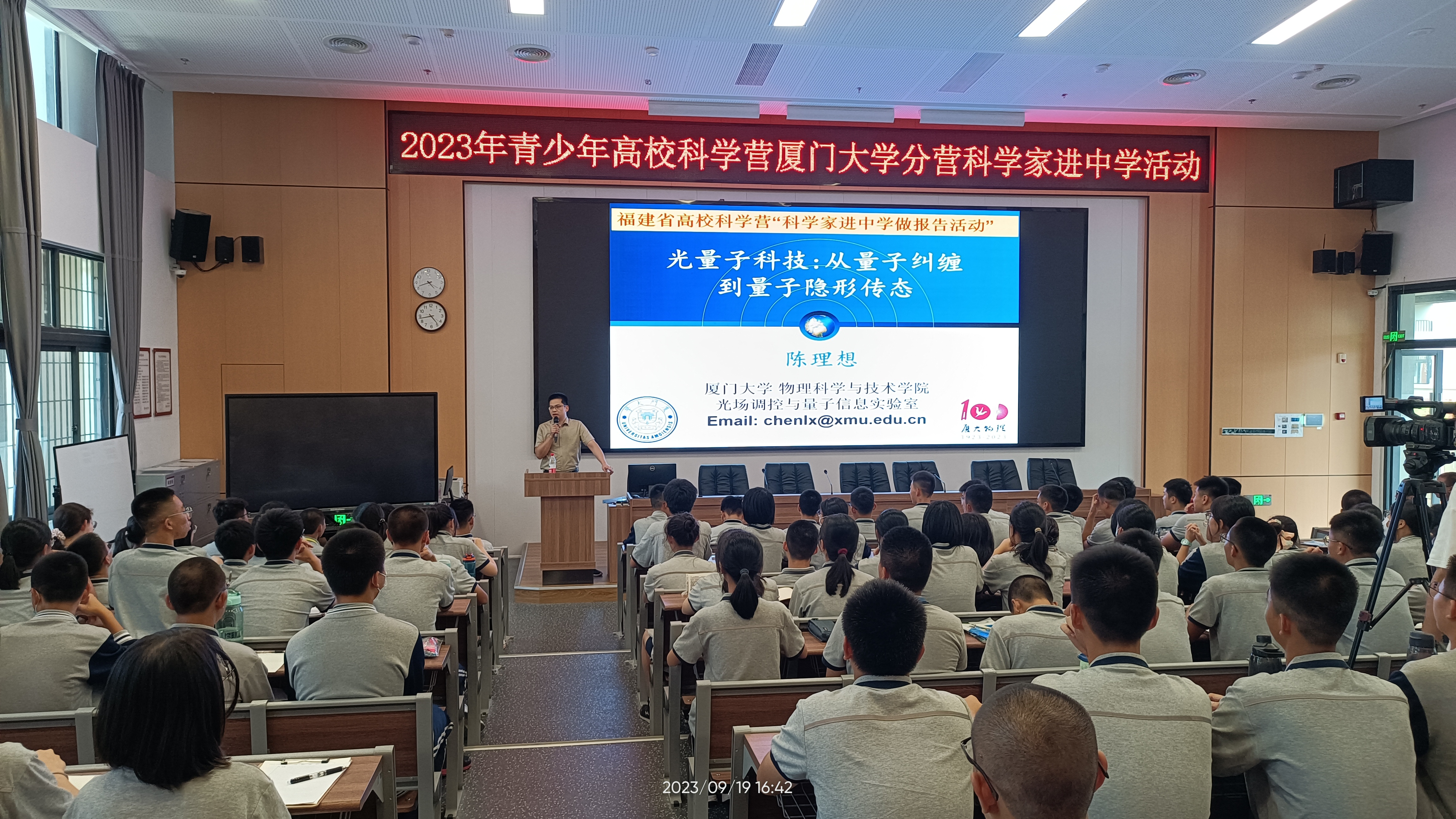 科技引领世界,创新成就未来。为认真贯彻党的二十大精神,落实习近平总书记在二十届中共中央政治局第三次集体学习时的重要讲话精神,为落实立德树人根本任务,促进高中与高校协同育人机制,为培养科技创新后备人才厚植沃土,为培养科技创新后备人才和德智体美劳全面发展的社会主义建设者和接班人。9月19日下午,2023年青少年高校科学营厦门大学分营科学家进中学活动走进厦门双十中学翔安校区高中部。厦门大学物理科学与技术学院副院长、教授、博导,教育部“国家级人才计划”青年学者,福建省青年拔尖创新人才,厦门市拔尖人才,教育部物理学类专业教学指导委员会委员,教育部物理学类专业教学指导委员会委员、中国物理学会“萨本栋应用物理奖”获得者、厦门大学2023年“我最喜爱的十位老师”陈理想为同学们带来了《光量子科技:从量子纠缠到量子隐性传态》的专题讲座。