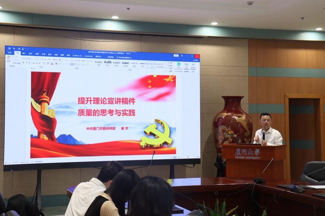 “91251”、“6000”和“28”,三个看似毫无关联的数字,却串起了汉字的”前世今生“。从一个个具体的字讲起,到一脉相承的中华文化,杨圆圆的宣讲见微知著、层层递进,配合着悠扬的音乐,淋漓尽致地展现蕴含在汉字中的“中国精气神”。无论是“中”字体现的中国智慧、“国”字承载的家国情怀,还是“新”字呼吁的青年担当,汉字中传扬的中国精神令同学们为之动容。通过《从汉字中窥见中华文化的“精气神”》这一宣讲,同学们也对宣讲的丰富内容和创新形式有了更为直观的感受。随后,厦门“学习强国”运行中心主任、中共厦门市委讲师团教师秦学为同学们带来了“提升理论宣讲稿件质量的思考与实践”主题培训。秦学老师以“骨架、门板和铆钉”这一生动的比喻,指出理论、故事和逻辑是宣讲稿不可或缺的三个要素。秦学老师还结合自身工作经历,逐句分析样例稿件修改前后的差异,使同学们直观地了解如何将三个要素有机结合。“千锤百炼出佳句”,通过秦学老师的分享,同学们也意识到宣讲稿需要反复的修改与打磨,才能达到引人入胜的效果。