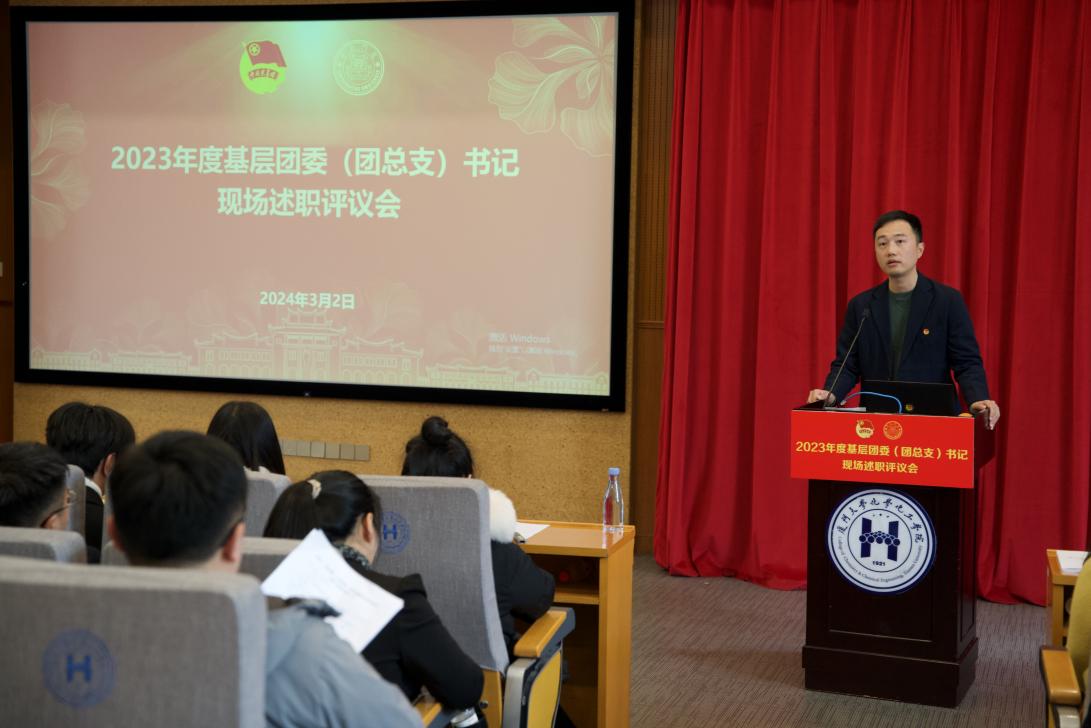 会上,41位基层团委(团总支)书记就2023年度工作情况开展汇报。他们紧扣共青团是“党的助手和后备军”的定位和“围绕中心、服务大局”的工作主线,从共青团思想政治引领、团员和青年主题教育、基层组织建设、社会实践活动开展、校园文化活动品牌建设、创新创业成果等工作出发,亮成绩、验成果、对标杆、找不足,分析2024年工作思路和重点方向。