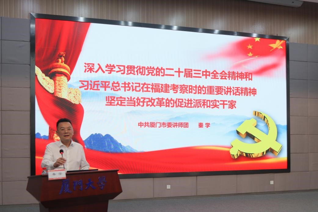 在培训中,秦学以生动的语言、鲜活的案例,讲述了上个世纪八十年代厦门成为经济特区以来,从一个经济落后的东南小城发展为经贸繁荣的现代化城市的壮阔历史。秦学指出,上世纪八九十年代以来,习近平总书记在厦门工作期间编制的《1985年—2000年厦门经济社会发展战略》的指导下,厦门市先后完成了筼筜湖治理、八卦楼修缮、厦门国际银行组建、国有企业改革等各领域改革工作,为厦门发展起到了奠基性、全局性的深远影响。而在党的二十届三中全会召开之际,我们更要坚定拥护“两个确立”、坚决做到“两个维护”,坚定贯彻“六个坚持”重大原则和“七个聚焦”战略要求,久久为功,推进中国式现代化行稳致远。同时,秦学对党的二十届三中全会提出的新思想和新论做了进一步解读,特别强调,在新质生产力和新一轮科技革命和产业变革加速演进的历史机遇期,青年一代应该挺膺担当、将小我融入大我,于变局中开新局。