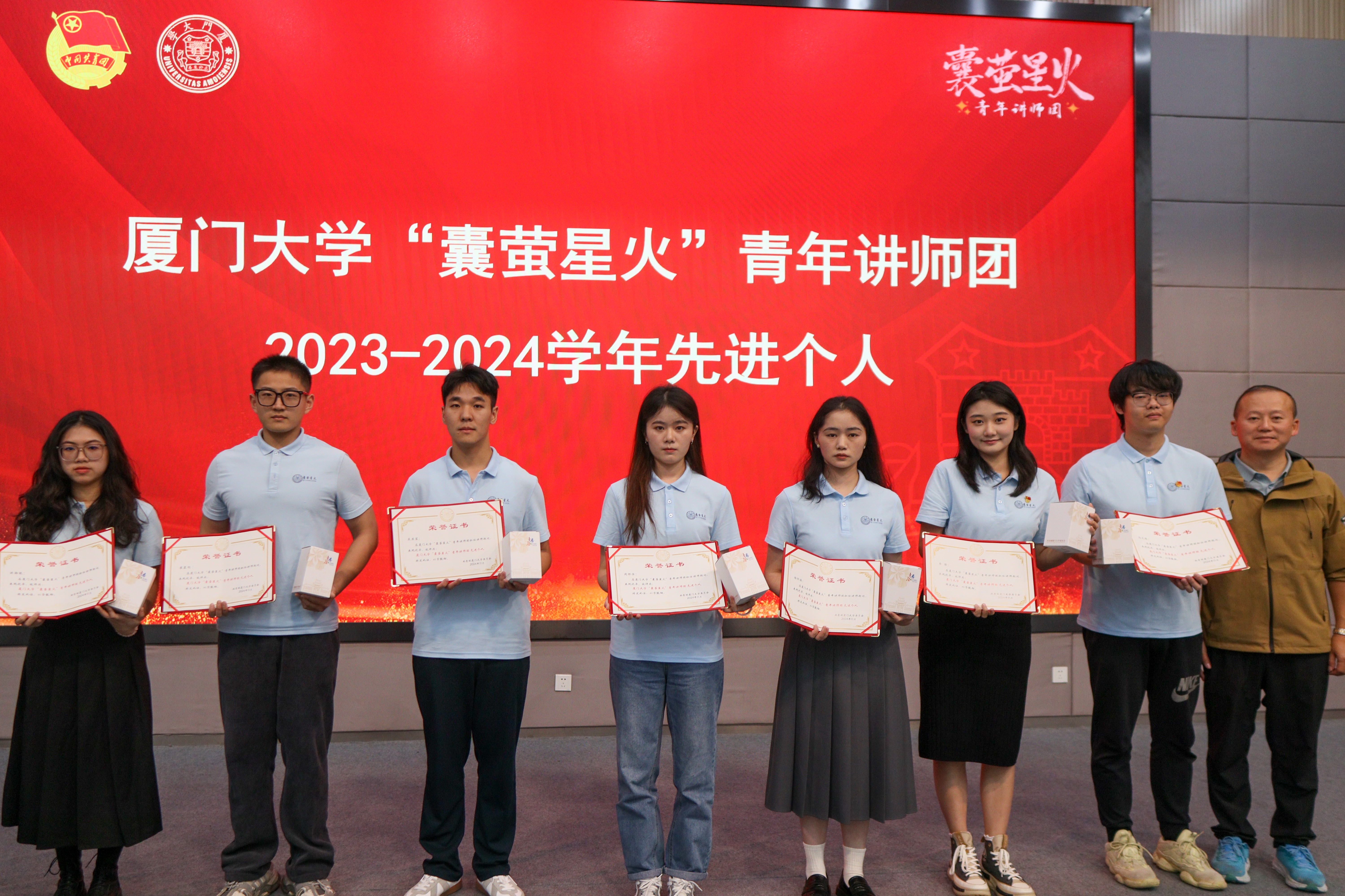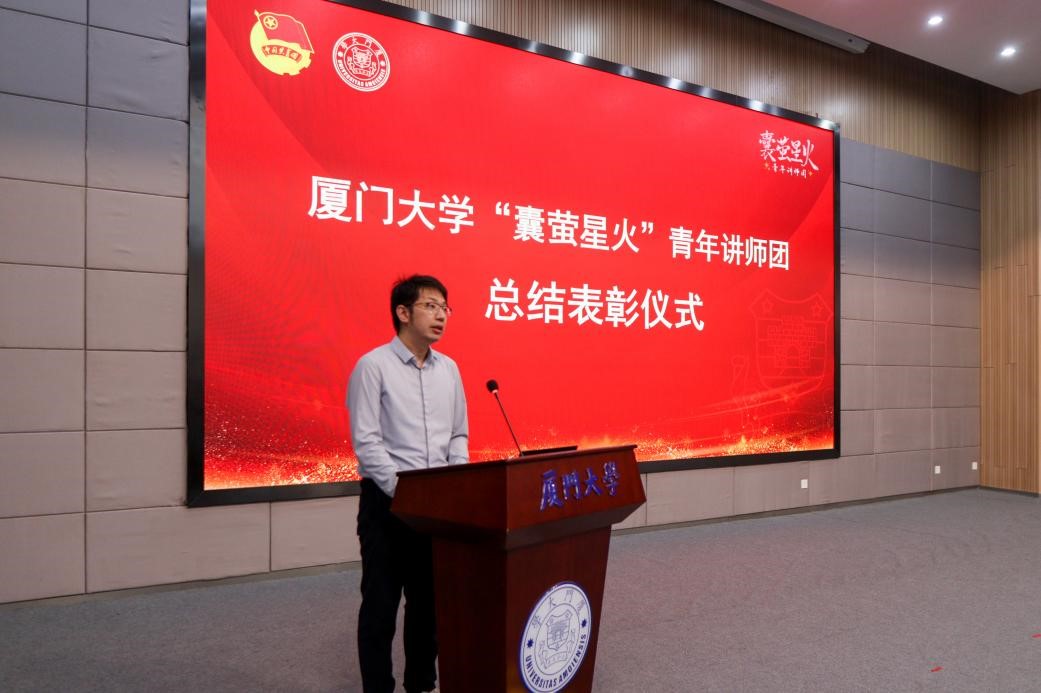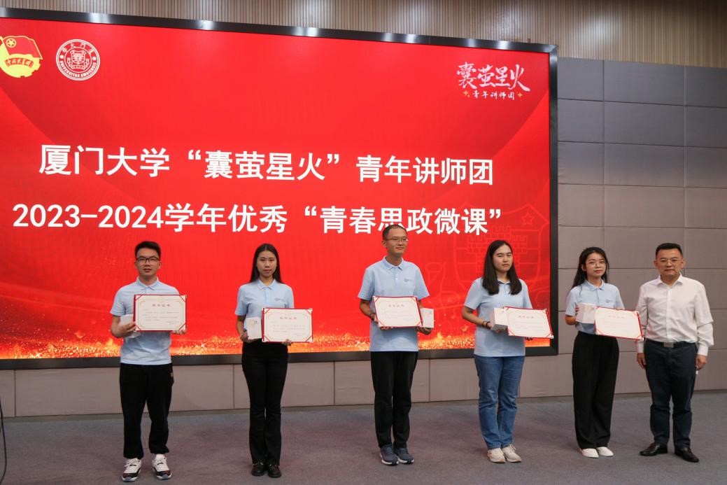 在首先举行的表彰颁奖式上,新闻传播学院洪湘妮等9名同学获评厦门大学“囊萤星火”青年讲师团先进个人,信息学院王少彬等5名同学的宣讲作品获评厦门大学“囊萤星火”青年讲师团“优秀青春思政微课”,洪海松和秦学分别为获奖者颁奖。