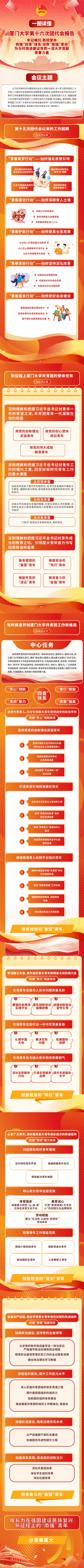 大会期间,共青团厦门大学第十五届委员会发布题为《牢记嘱托 勇担使命 构建“四青”体系 培养“南强”青年 为与时俱进建设世界一流大学贡献青春力量》的工作报告。报告系统回顾了共青团厦门大学第十五次代表大会召开以来厦大共青团取得的各项成绩和经验,提出了新征程上厦大共青团的使命任务和思路举措。
