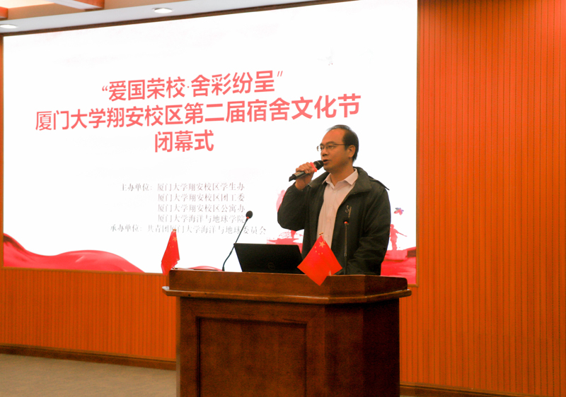 闭幕式首先由邱荣锋老师致辞。他代表学院向翔安校区学生办、公寓办、团工委和各学院的大力支持表示衷心的感谢,对参与本次宿舍文化节并取得优异成绩的宿舍表示祝贺。他强调,大学宿舍是同学们的另一个家。宿舍文化节活动的举办旨在让同学们在参与的过程中增进友谊,感受宿舍的温暖,养成勤于动手、美化环境的良好的习惯。他希望同学们在今后的学习和生活中继续保持建设文明宿舍的热情,营造良好的宿舍环境。同时,以良好的宿舍环境为基础,共同营造良好的校园文化环境,为创建积极向上、和谐文明的校园做出自己的贡献。