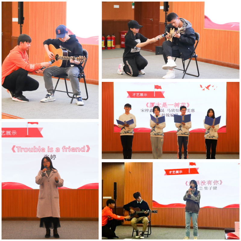 紧接着,主持人带领同学们回顾了宿舍文化节活动的精彩时刻,总结了同学们在不同活动中收获的点点滴滴。在回顾完宿舍文化节的各项活动后,五组同学带来了才艺展示。表演节目精彩纷呈,不仅有悠扬动听的吉他伴唱《如果没有你》,吉他独奏《blue》《梦中的婚礼&爱的罗曼史》以及节奏欢快、旋律优美的英文歌曲《Trouble is a friend》演唱,更有别具一格的诗朗诵节目——《厦大是一树花》。《厦大是一树花》诗朗诵节目别出心裁,内容贴近校园生活,节目后半段陡然转折的欢快曲调一改同学们以往对诗朗诵节目的传统印象,将全场气氛推向高潮。