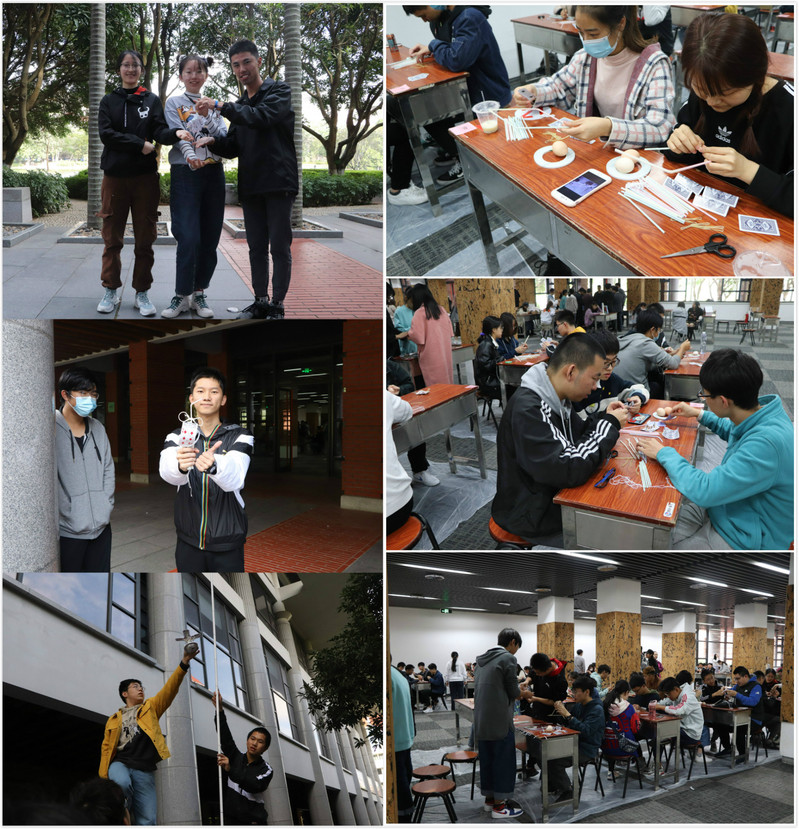 20根吸管、2米尼龙绳、5根皮筋、5张扑克牌、一卷双面胶,加上同学们扎实的理论基础以及奇思妙想,渴望得到保护的生鸡蛋成功“自由飞翔”。参赛选手需在45分钟限定时间内制作出装置保护鸡蛋,能让鸡蛋从更高处落下而不破碎者获胜。伴随着同学们的欢呼,建筑与土木工程学院“怎么设计都不队”以最高的成绩获得一等奖。在此次团队合作中,许多同学都展现了不凡的动手能力,更是在一次次的尝试中加深了对材料结构的认识。