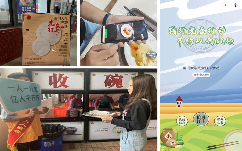 为传递“光盘”理念,传承节约美德,由校团委主办,信息学院团委、校学生会、研究生会承办,经济学院学生会协办的“光盘打卡”活动在各个食堂拉开序幕。活动依托我校学生团队设计开发的“光盘打卡”小程序进行,鼓励同学们通过上传用餐“光盘照”的形式,在小程序内进行打卡,积累能量积分,累计一定数额即可换取“厦门大学百年校庆”系列精美产品。活动通过积分换礼的形式,鼓励同学们养成良好习惯,引导同学们常思“谁知盘中餐,粒粒皆辛苦”,将“光盘行动”践行到底。光盘打卡活动上线三天,累计活跃师生总4050人,累计打卡次数总5641次。