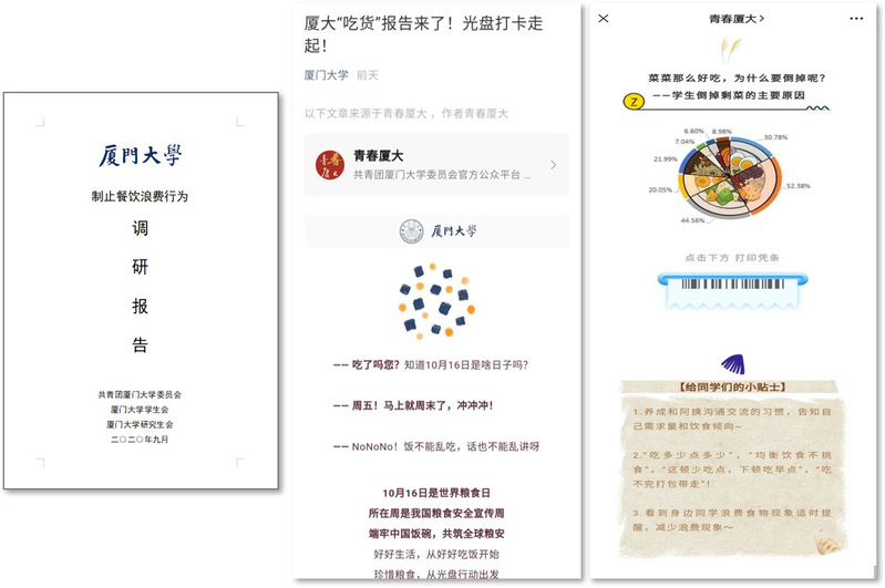 为了解我校学生食堂就餐的实际情况,校团委、校学生会、研究生会制作并发布了“厦门大学制止餐饮浪费行为调研”问卷,收集有效样本2060份并根据问卷结果撰写调研报告。该问卷听取并反映了学生的心声,为解决现有问题,提出了切实可行的建议,倡导同学们珍惜粮食,合理消费,传递“光盘”理念,引领校园文明风尚。校团委还将调研结果结合“光盘打卡”活动制作成图文推送,当天阅读量近2万人次。