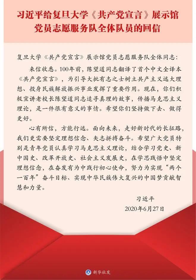 6月27日,习近平总书记给复旦大学《共产党宣言》展示馆党员志愿服务队全体队员回信,勉励他们继续讲好关于理想信念的故事,并对全国广大党员特别是青年党员提出殷切期望。厦大团委第一时间组织青年学子学习热议习近平给复旦大学青年师生党员的回信,大家表示将牢记总书记嘱托,坚定理想信念,矢志拼搏奋斗。