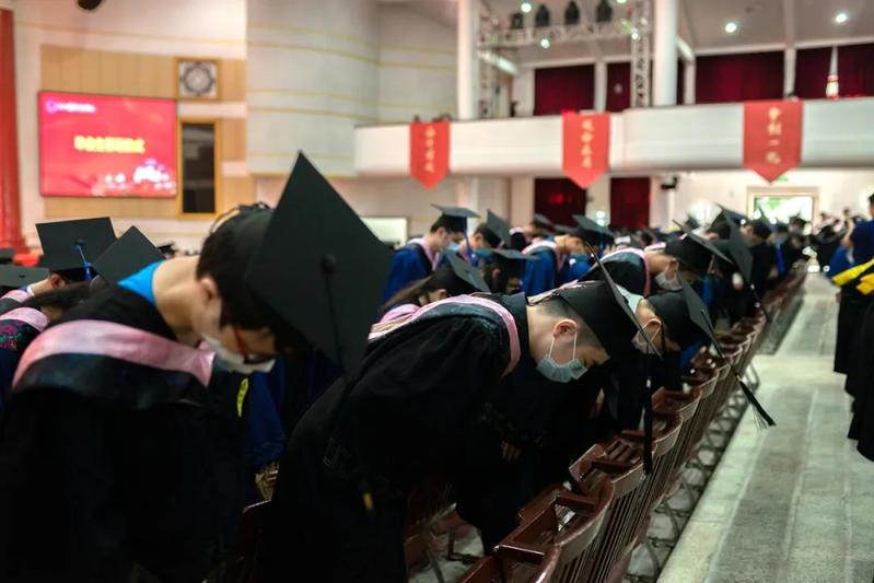 全体毕业生起立,在《感恩的心》的歌声中,向教师代表,学校从事实验室、图书馆、行政管理以及后勤服务的工作人员代表,毕业生家长和亲友鞠躬致谢。随后,毕业生们集体宣誓,表示将秉承校主心系祖国之底蕴,弘扬南强四种精神之光荣,勇于创新、大爱无疆,为民族伟大复兴,为造福人类共同伟业,不忘初心、贡献力量。