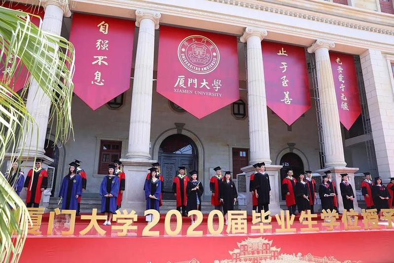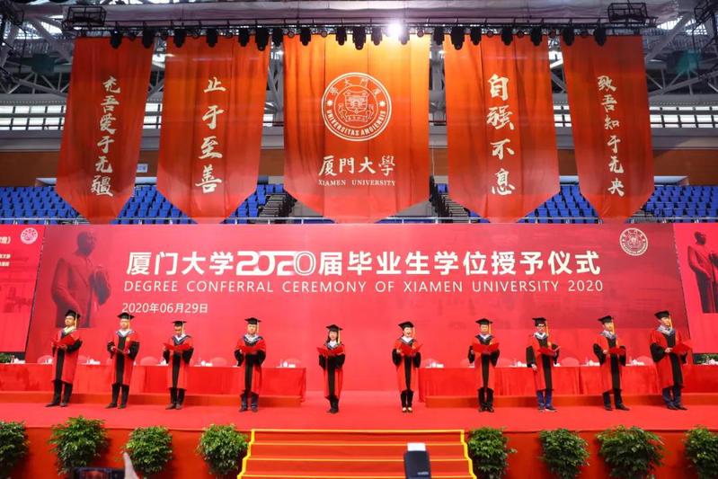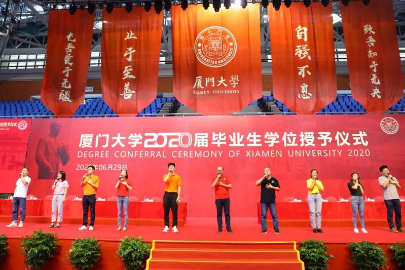 今年的学位授予仪式别具一格,活动现场悬挂着“自强不息,止于至善”“致吾知于无央,充吾爱于无疆”“今日南强学子青春无悔,明日社会栋梁建功立业”“同学年少风华正茂,乘风破浪海阔天高”等巨大条幅,翔安校区的学位授予仪式还包括青春歌曲合唱、诗朗诵,放飞写有学生签名和寄语的彩色气球等环节。