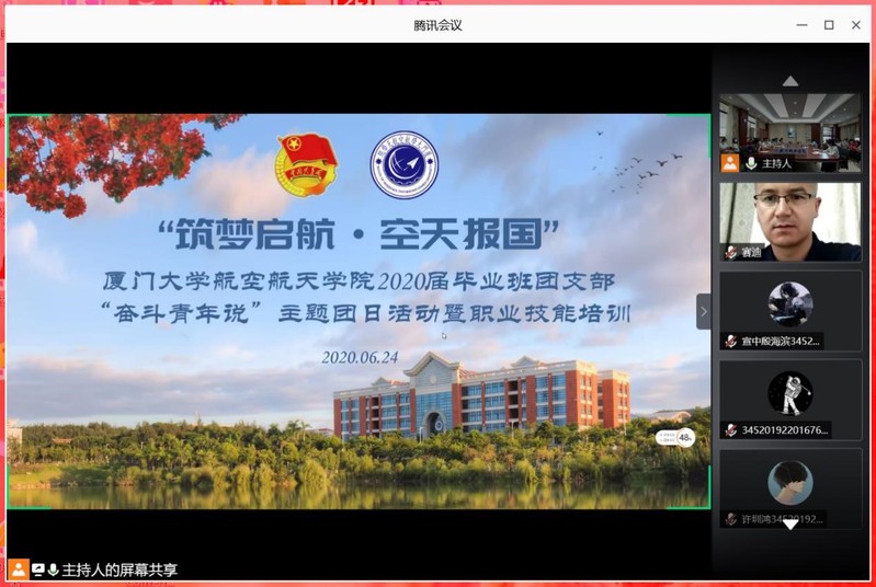 6月24日上午10点,厦门大学航空航天学院2020届毕业班团支部“奋斗青年说”主题团日暨职业技能培训活动在航空航天学院大楼501会议室举行。校学生工作处处长李峰,校团委书记曾铮,翔安校区管委会副主任黄宇霞,航空航天学院党委书记王康平、常务副院长尤延铖、党委副书记张晴、党委副书记林蔚,博士生导师、工程技术中心主任肖望强,航空航天学院2004级机电工程系系友、新疆维吾尔自治区团区委办公室副主任赛迪艾合麦提•亚尔麦麦提,学院毕业班班主任代表、全体辅导员、2016级本科机械2班团支部成员、2016级其他本科毕业生参加了活动。