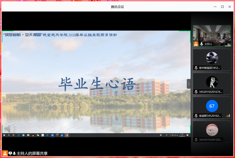 随后的学生代表分享中,有即将去往中国航发湖南动力机械研究所就职的曾湘衡,有获得国家奖学金并被《人民日报》刊登优秀事迹、即将去往北京航空航天大学深造的郭佳凡、还有即将去往中科院自动化研究所深造的来自武汉的康丽雯。他们或分享自己面临抉择而选择投身国家重点行业的所思所感,或分享四年遇见自身成长蜕变的心路历程,或分享自己目睹抗疫前线一幕幕动容画面的感慨和启示。