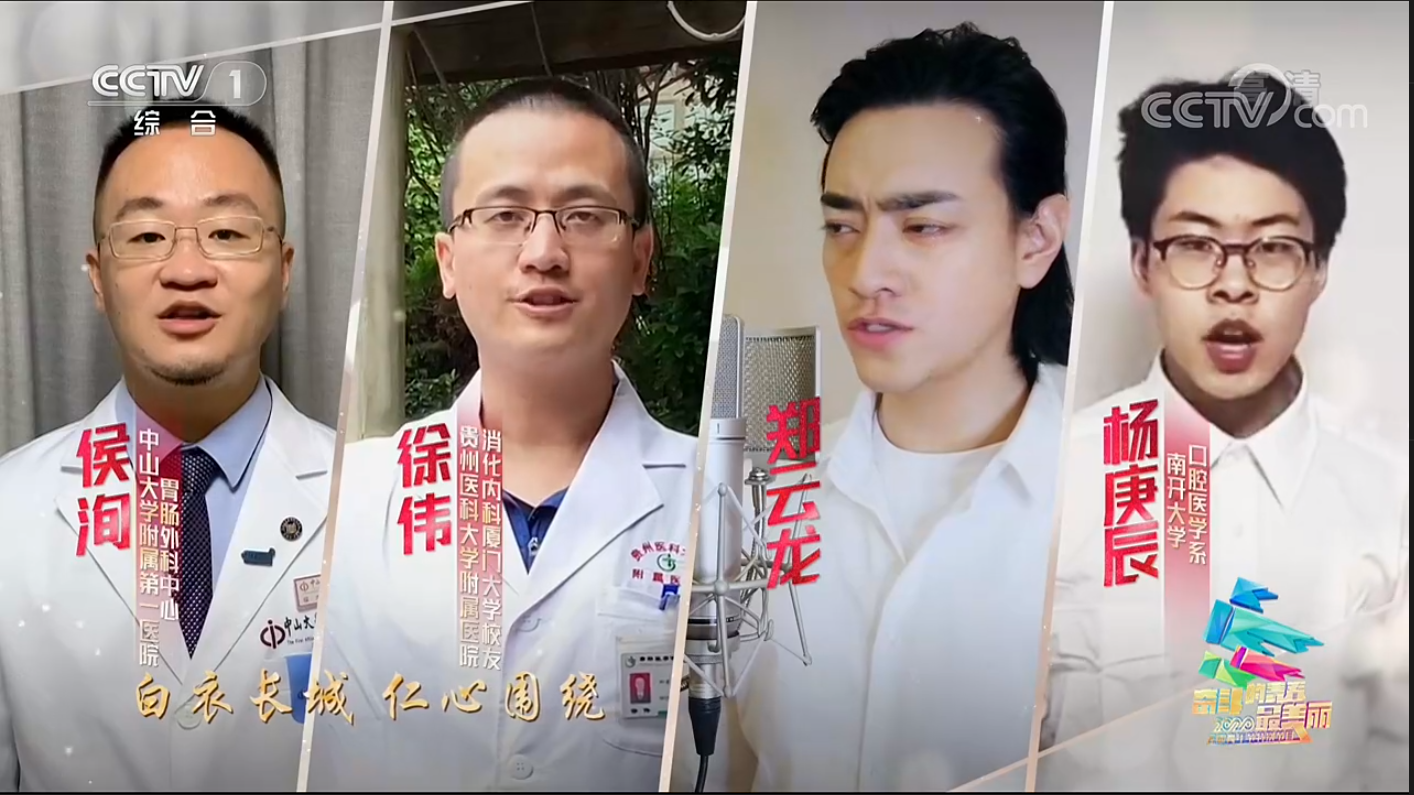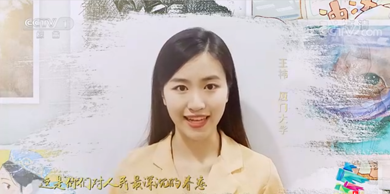 厦门大学学生艺术团执行团长杨怡婷参与演唱开场歌曲《春暖花开》,与莘莘学子一道,以优美歌喉为大家带来明媚春光。岁初,各大高校纷纷派遣医疗队驰援湖北,青年们用青春和汗水构建起一道白衣长城。厦门大学校友(贵州医科大学附属医院消化内科医生)徐伟也是他们中的一员,一首慷慨激昂的《白衣长城》道出了他们的拳拳之心。音、诗、画是与疫情抗争时的强心剂,厦门大学学生艺术团执行副团长王祎与其他高校学子一起,用如诗篇的言语、如清泉的温婉将画作的故事娓娓道来,将艺术的力量远播四方。