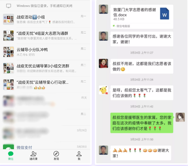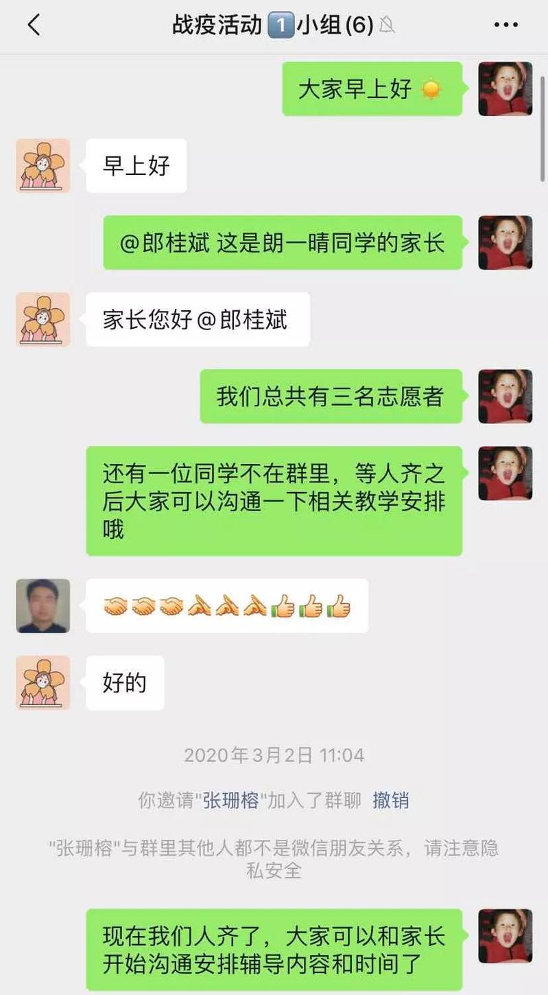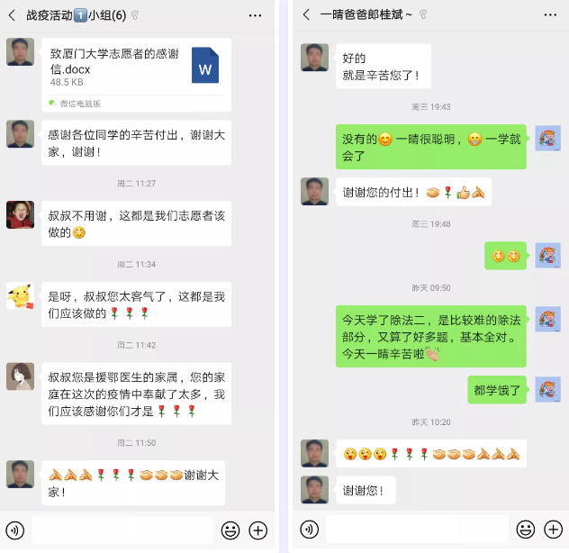 瘟疫无情人有情!2020年3月2日厦门大学外文学院西班牙语专业的张思楠同学给我打电话,“关切的询问孩子在学习上有什么困难?说要安排几名志愿者帮忙给孩子进行课业辅导”,这真是久旱逢甘雨啊!没过几天,思楠就联系了厦门大学医学院临床专业的张梦雨同学,厦门大学化学化工学院的张珊榕同学、厦门大学管理学院的彭焱同学、公共事务学院的吴艺敏同学,并建立了“战役活动帮扶小组”微信群,开启了孩子的学业辅导工作。