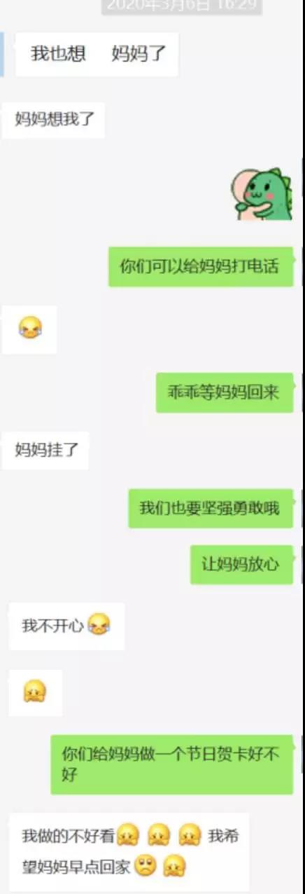 3月6日,黄子瑜以即将到来的妇女节为主题,给孩子们上了一节关于亲情的课。下课后,姐妹俩给她发来微信,表示自己很想念正在医院工作的妈妈,可是妈妈工作忙,每次说不到两句就只能匆匆挂掉电话。黄子瑜提议可以给妈妈做一张妇女节贺卡,但孩子们却说只希望妈妈早点回家。姐妹俩稚嫩的回复深深戳中了黄子瑜的内心。