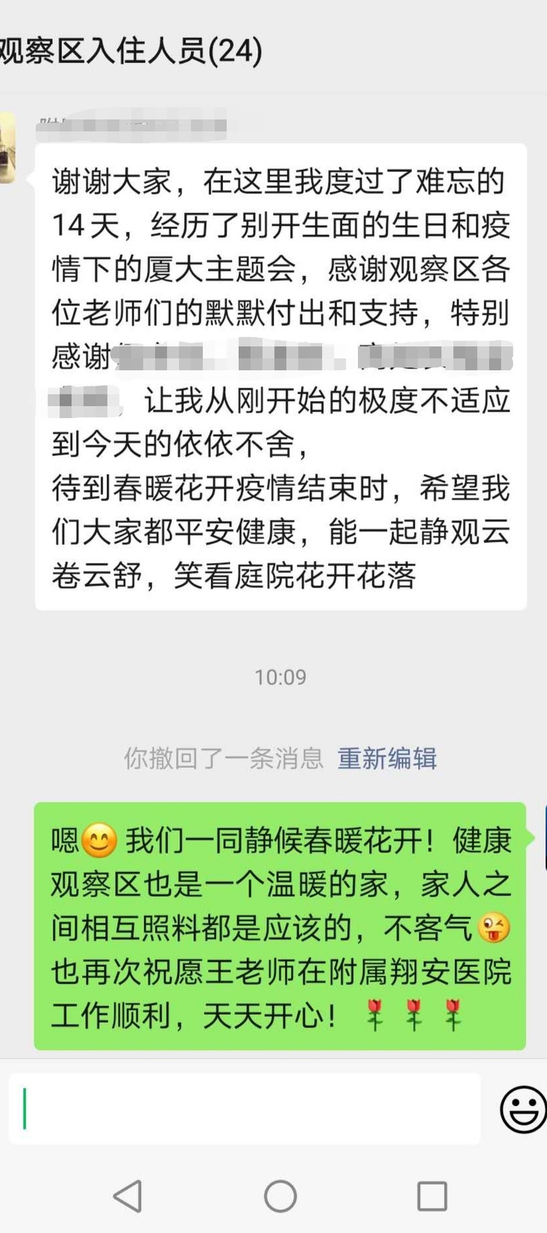 “解除观察后,我也要加入翔安校区青年志愿服务队伍,贡献自己力所能及的一份力量!”