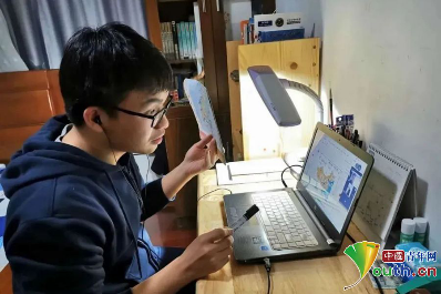 华南师范大学“青年战疫云支教突击队”志愿者何智升在线辅导孩子功课。团广东省委供图