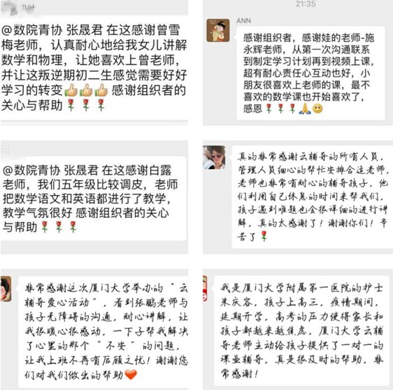 “要让研究生支教团的志愿服务精神发扬光大!”厦门大学第21届、22届研究生支教团的成员也主动加入了这次“云辅导”活动之中,他们纷纷表示,要让研究生支教团的志愿精神在这个“特殊”的寒假继续闪光!