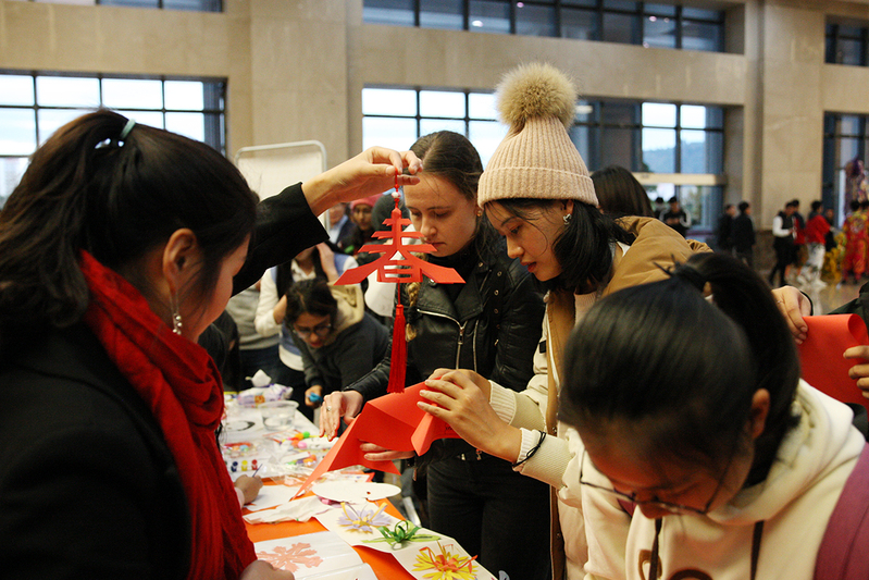 精彩无比的文化荟萃联欢落下帷幕,“中国日”文化节的精彩还在继续。在欢快激昂的舞龙舞狮表演队的一路带领下,欣赏完文化表演的师生来到德旺图书馆北区大厅的文化体验活动区。不论是凝结着中国人平安祈福的中国结绳、行云流水的中国传统书画、童趣无穷的中国传统游戏、余音绕梁的中国传统乐器、飘逸婉约的中国传统服饰,还是精巧灵动的中国剪纸、优雅明净的中国茶文化……每个体验区的互动活动都吸引着众多体验者,他们或是中外学生、或是老师、或是后勤人员,现场的每一个人都切实地感受到中国文化的独特魅力。