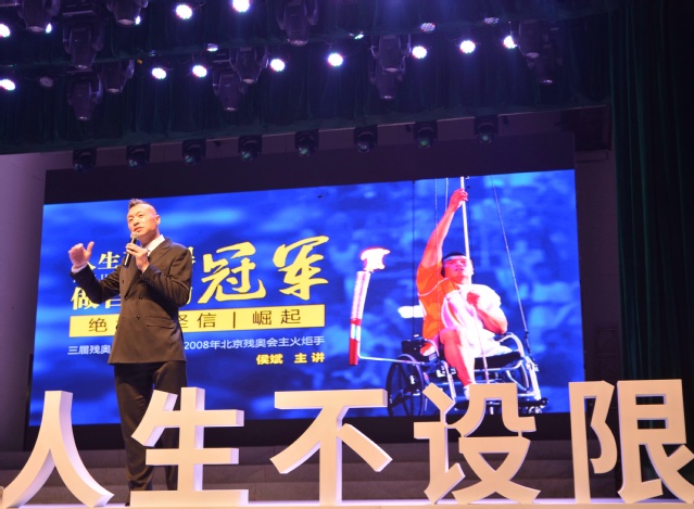 在演讲中,侯斌分享了自己在成为三届残奥会冠军过程中的经历的苦辣与辛酸,讲述了自己唱歌、修手表、学画画、当工人,以及成为残疾运动员的励志故事。他激励同学们以自己的付出和汗水去迎接未来的挑战。