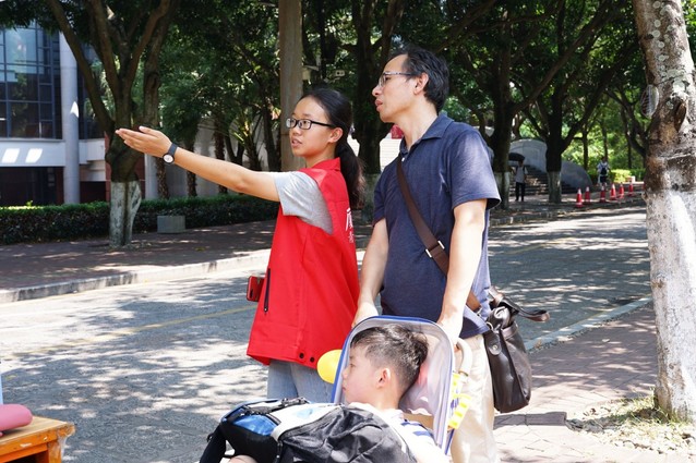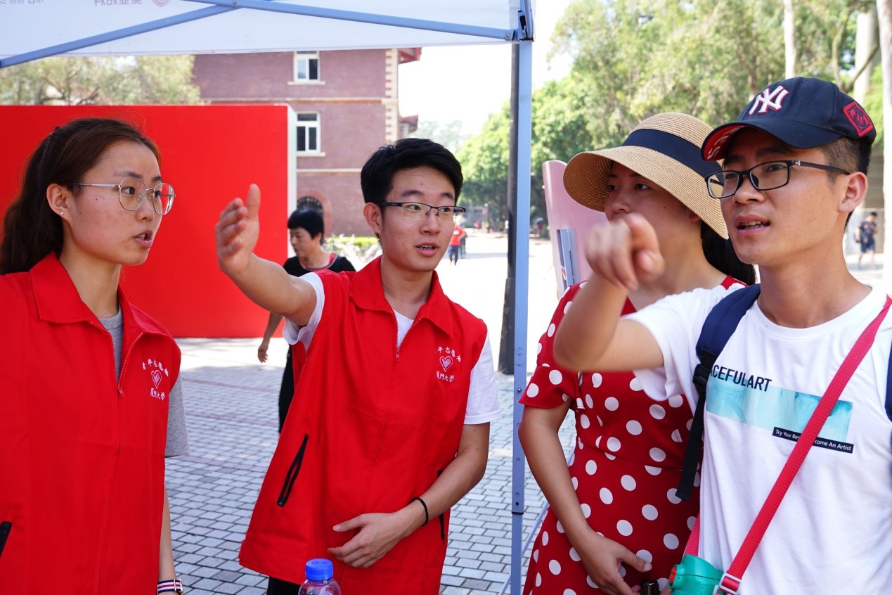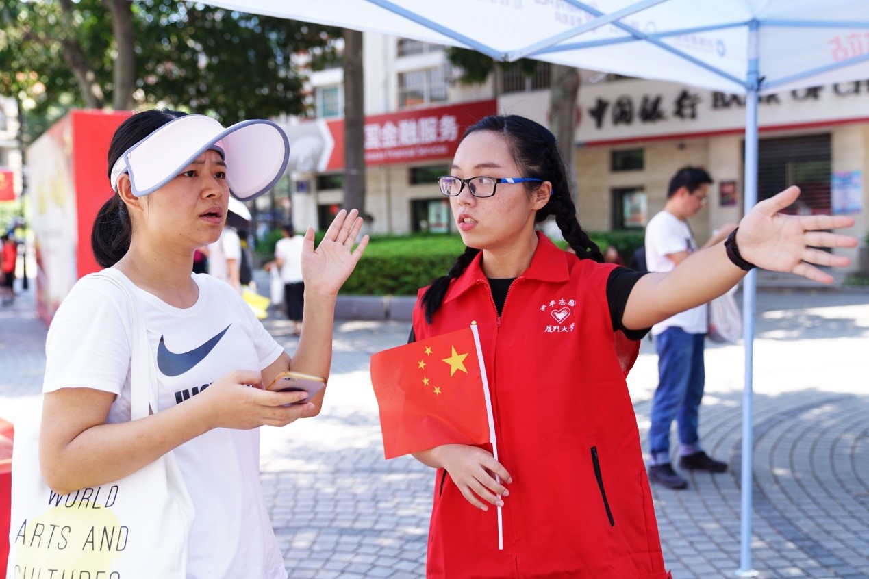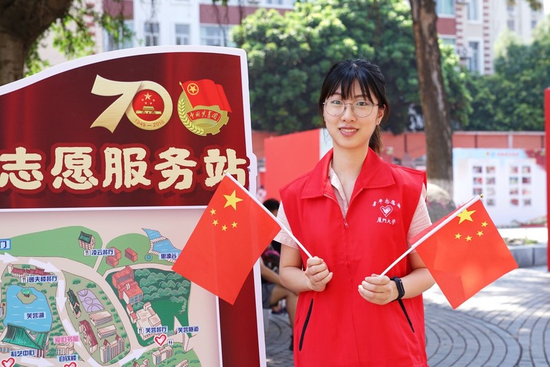 这是来自王亚南经济研究院2018级研究生郑宇琪一天中听到最多的问题。她表示,作为国庆假期校园服务站的志愿者,其使命和任务是帮助和引导游客更顺利地游览和更深入地认识美丽的厦门大学,并且适逢中华人民共和国成立七十周年,作为此次活动唯一的研究生志愿者,更加感受到了非凡的意义和责任。她说,无论是邀请游客参与“我与国旗合个影”的活动,还是向游客解答“芙蓉隧道怎么走”、“哪里可以购买厦大纪念品”,甚至有关在厦大的学习生活等问题,都让我感受到内心满满的热情与激动。