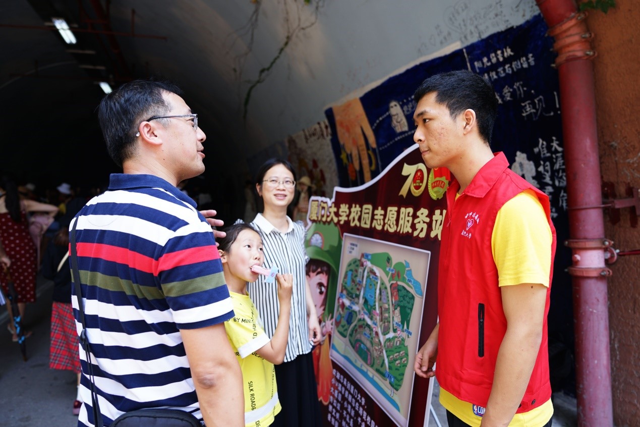 志愿者江玉栋是管理学院2018级本科生,他是芙蓉隧道志愿服务站的一员,负责引导游客文明游览芙蓉隧道、劝阻涂鸦行为。他表示,他并没有发现有游客在墙上乱涂鸦,游客们都非常文明并且被厦大学子精彩的艺术创作所吸引而久久驻足。他说,芙蓉隧道的“涂鸦”记载着几代厦大人的厦大故事。在祖国生日之际,能够引导来自各地的游客观览涂鸦、了解厦大故事,同时保护涂鸦创作不被破坏,这对其来说既是一种荣誉,也是沉甸甸的责任。希望有越来越多的人能够感受厦大的美、爱上厦大的美。