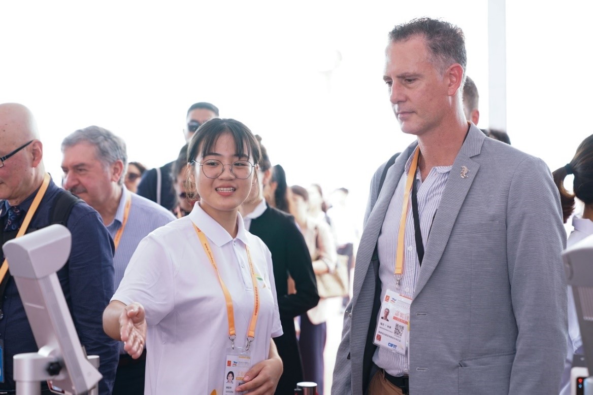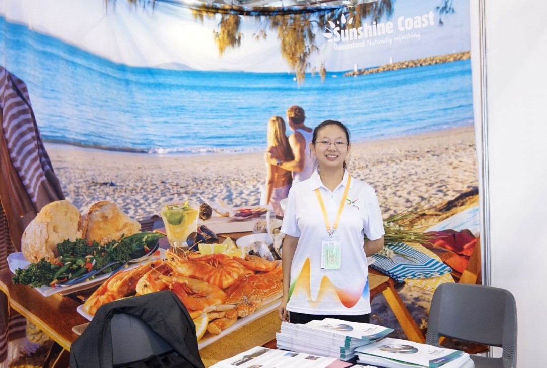 “Welcome to Sunshine Coast”来自国际学院的2018级本科生吕佳涵是翻译组的一员,对接的是来自澳大利亚昆士兰阳光海岸的外宾。她表示,在向中国嘉宾们介绍澳大利亚的项目,以及向澳大利亚展商介绍中国特色的产品的过程中都让她的交流能力有极大提升,面对外国友人愈发自如。她说:“在陪同展商参观其他展区的过程中,我带他们体验了中国的电动按摩仪,他们对中国的电车、无人机等高科技产品都十分感兴趣,我和外宾也结下了深厚友谊。我能够为这次活动做出自己的一份贡献,并且交到几个好朋友,我感到十分开心和满足。”