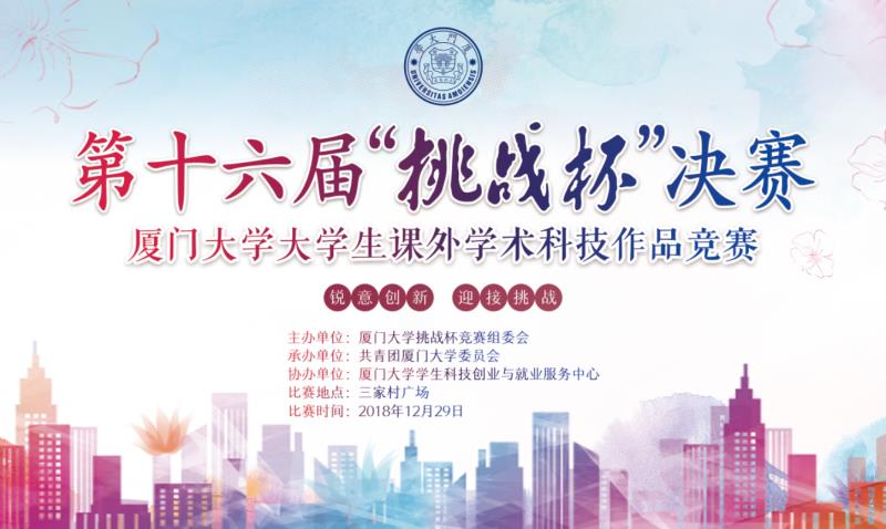 2018年12月29日,由厦门大学第十六届“挑战杯”竞赛组委会主办,共青团厦门大学委员会承办,厦门大学学生科技创业与就业服务中心协办的第十六届“挑战杯”厦门大学大学生课外学术科技作品竞赛决赛在思明校区三家村广场隆重举行。校赛自2017年12月启动以来,历时一年,经过立项、初筛、复赛等阶段,共有47件作品入围决赛,涵盖了机械与控制、信息技术与数理、能源化工、生命科学、哲学与社会、经济与管理等多个学科领域。