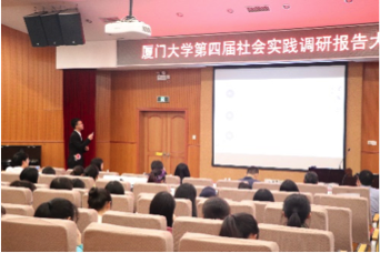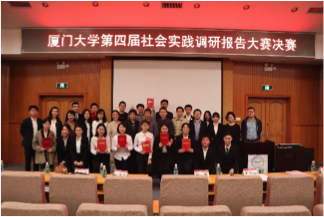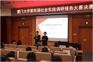 2018年12月7日晚7:00,由厦门大学教务处、共青团厦门大学委员会主办、厦门大学公共事务学院承办的“厦门大学第四届社会实践调研报告大赛决赛”于化学报告厅顺利举行。本次大赛由公共事务学院张庆才副教授、王伟光副教授、聂爱霞副教授以及陈芳副教授担任专业评委,校现代教育技术与实践训练中心实训部部长童刚清、校团委社会实践部与科创部部长姚东明、公共事务学院党委副书记刘钟南、团委书记徐莹、团委副书记蒋慧琼以及谭超、苏毅辉和李思颖三位辅导员老师出席了此次大赛。本次大赛以“分享实践故事,见证青春成长”为主题,向我们展示了十支优秀实践团队精彩绝伦、意义非凡的实践经历和调查成果,激励了当代青年学子在调查中积累知识,于实践中体味人生。近百余名学生到场观看并积极参与互动,气氛热烈,比赛过程严肃又不失活泼。