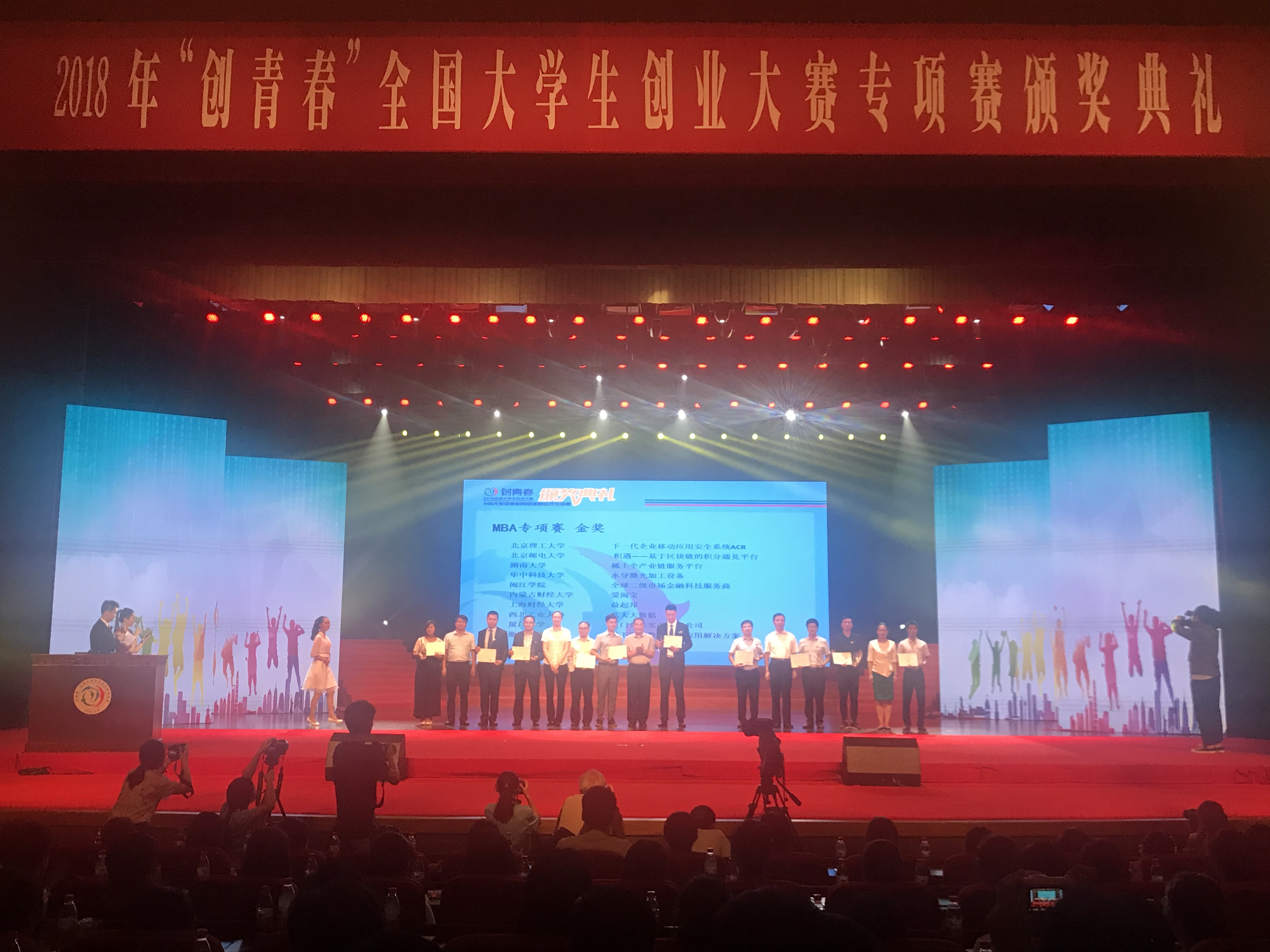 2018年7月13日至15日, 2018年“创青春”全国大学生创业大赛MBA专项赛和网络信息经济专项赛在浙江师范大学举行。我校3个项目入围终审决赛,并喜获金奖1项、银奖1项、铜奖1项的骄人成绩,总成绩位居全国高校前茅。其中,自MBA专项赛开办三届以来,我校已连续三届蝉联金奖。