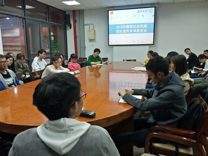 刘艳杰在开场时对各实践队在寒假期间的认真工作表示充分肯定,并强调此次座谈的主要目的是共同分享各团队在招生宣讲过程中的经验和遇到的问题,为厦门大学2018年招生政策的制定提供一些参照。