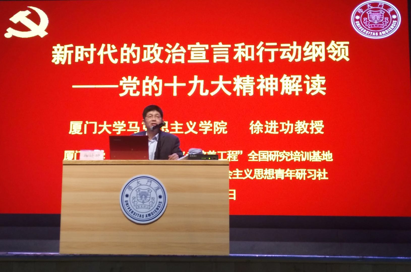 2017年12月17日晚,由厦门大学“青年马克思主义者培养工程”全国研究培训基地主办、厦门大学习近平新时代中国特色社会主义思想青年研习社承办的党的十九大精神解读报告会在建南大会堂顺利举行。报告会邀请了校党委宣传部部长、厦门大学新闻发言人、马克思主义学院徐进功教授作题为《新时代的政治宣言和行动纲领——党的十九大精神解读》的报告。参加理论报告会的有:校学生会、校研究生会和校社团联合会全体委员、团校学生骨干训练营、研究生骨干训练营、社团骨干训练营和团学宣传骨干培训班全体成员以及各学院团总支书记、团支部书记共1000余人。报告会由校团委副书记廖晓波主持。