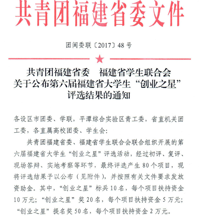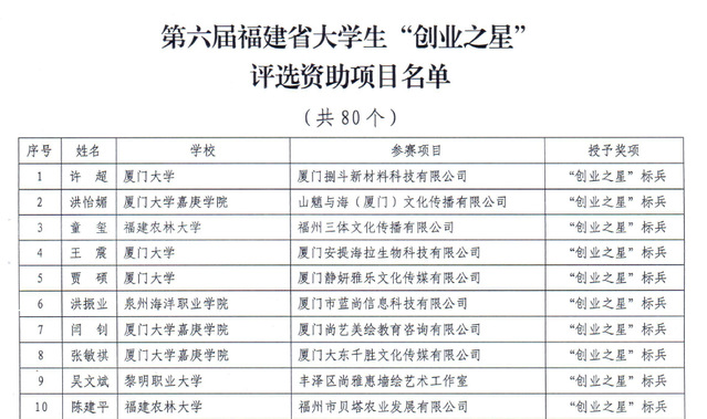 近日,第六届福建省大学生“创业之星”评选结果揭晓,我校喜获“创业之星”标兵3项(全省10项)、“创业之星”1项,“创业之星”提名奖2项。