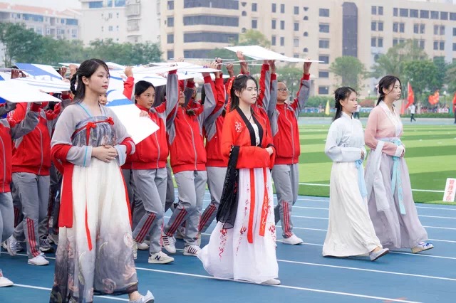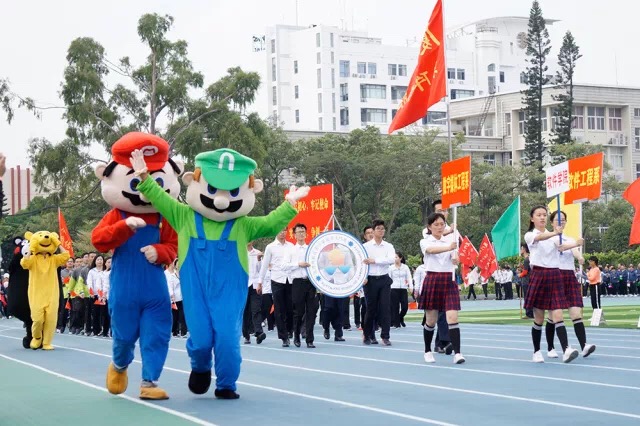 伴着振奋人心的运动员进行曲,入场式于八点三十分正式开始。思明校区各大学院的的方队井然有序地进入场地,昂首挺胸,雄姿英发。最先映入眼帘的是来自经济学院和王亚南经济研究院的师生队伍,他们高举旗帜,迈着坚定的步伐经过主席台,尽显我校学子昂扬向上的风采;来自人文学院的师生方阵充分展现了厦大学子“文能提笔安天下,武能演武定乾坤”的风采,他们用自己的实际行动诠释了“健康人文”的理念;来自材料学院的方队迈着矫健的步伐,高喊着嘹亮的口号,精神抖擞,步履从容,他们用“真材实料”告诉世界什么是真正的风采;来自法学院的师生队伍们高喊着“厦大法律,响彻寰宇,南强学子,再创佳绩”的口号,他们坚定的目光展现了属于南方之强的英姿。不同学院方阵各具特色,共同为体育场增添了一抹鲜亮的色彩。