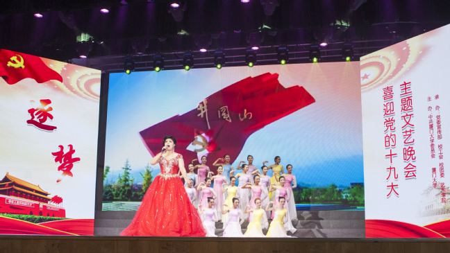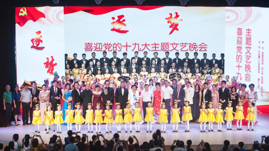 为迎接党的十九大胜利召开,10月16日晚,厦门大学喜迎党的十九大主题文艺晚会在建南大会堂隆重举行。此次演出由中共厦门大学委员会、厦门大学主办,党委宣传部、校工会、校团委、艺术学院承办。校长张荣,党委副书记、纪委书记赖虹凯,副校长詹心丽,校长助理赵铁出席活动。