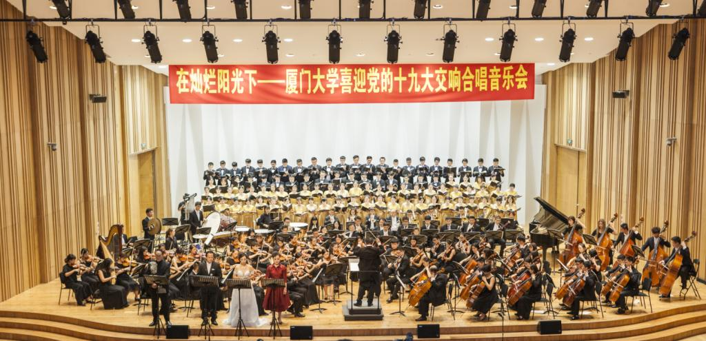 为迎接党的十九大胜利召开,10月13日晚,厦门大学交响乐团和合唱团的师生们在科学艺术中心音乐厅献上一场名为 “在灿烂阳光下”的交响合唱音乐会。此次演出由中共厦门大学委员会、厦门大学主办,由党委宣传部、艺术学院承办。校党委书记张彦,党委副书记、纪委书记赖虹凯,党委副书记林东伟,副校长詹心丽出席活动。