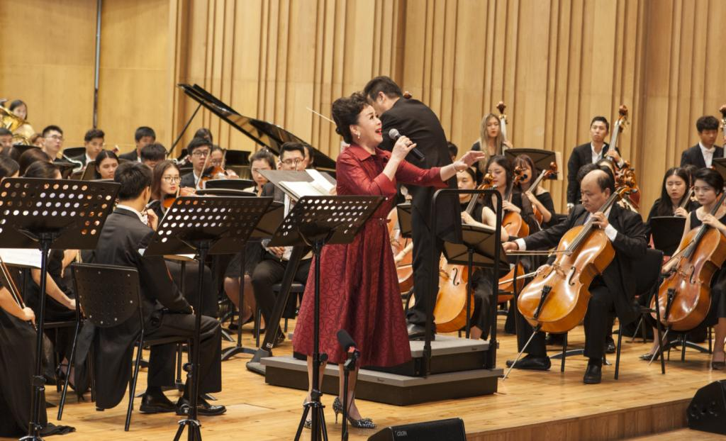 音乐会由黄飞老师担任指挥,一曲交响合唱《在灿烂阳光下》拉开了演出的序幕,动听的旋律一开始就将观众带入情境,让人深切感受党领导全国人民走过的风雨历程。接下来一首男中音独唱《黄河颂》以磅礴厚重的曲调,歌颂了母亲河以其生生不息激励着一代代人奋发抗争的伟大精神和坚强气魄。《绣红旗》以独具地方特色的旋律,赞扬了江姐等共产党人视死如归的革命精神以及对新中国的向往之情。女高音独唱《我爱你中国》将广大中华儿女对祖国的炽热情感展现得淋漓尽致,令人动容。一首《公仆赞》歌颂了好干部孔繁森两袖清风、扎根西藏、一生为民的无私情怀。男高音独唱《跟你走》以激昂的曲调唱出了人民坚定信念跟党走、不畏艰难斗志昂扬的伟大情怀。女高音独唱《爱我中华》以欢快的旋律表现出全国各族人民对祖国的深深爱意。