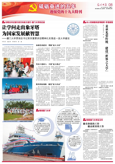 9月26日,《光明日报》“砥砺奋进的五年迎接党的十九大特刊”整版推出我校报道,详细报道自党的十八大以来,我校深入贯彻落实习近平总书记系列重要讲话精神,大力弘扬嘉庚精神,秉承“自强不息,止于至善”的校训,在建设世界一流大学的征程中取得的成就。