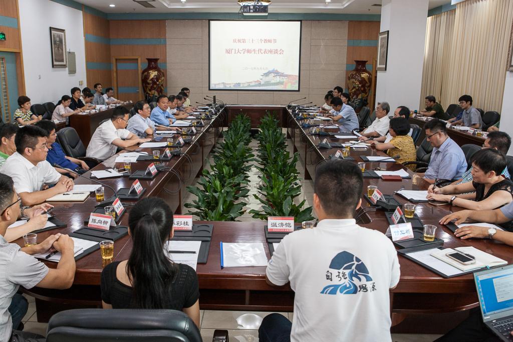 今年9月10日是我国第33个教师节。在党的十九大即将召开之际,组织好2017年教师节庆祝活动,全面展示党的十八大以来在习近平总书记教育思想指引下,教育和教师工作取得的新进展新成效,教师队伍呈现的新形象新风貌,对于营造尊师重教的浓厚社会氛围,团结凝聚全系统的力量,为实现中华民族伟大复兴的中国梦作出新贡献,具有特殊的重要意义。为庆祝教师节,9月9日下午,学校以“迎接党的十九大,当好学生引路人”为主题,在颂恩楼215会议室召开了2017年教师节师生代表座谈会。校党委书记张彦出席并讲话。校党委副书记、副校长李建发主持。