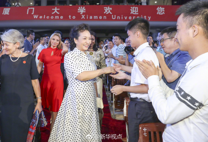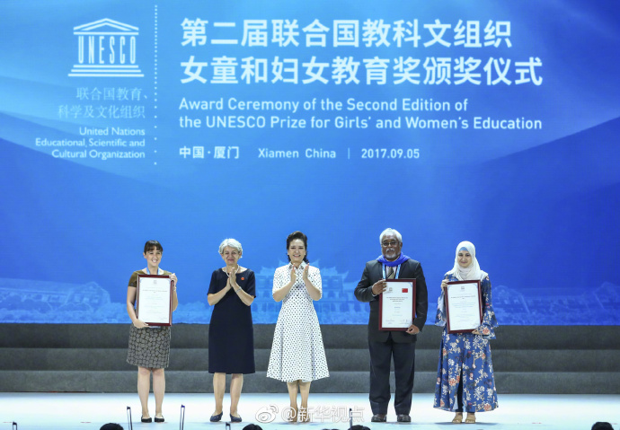 9月5日,国家主席习近平夫人彭丽媛同金砖国家领导人第九次会晤和新兴市场国家与发展中国家对话会外方团长夫人共同出席在厦门大学举行的第二届联合国教科文组织女童和妇女教育奖颁奖仪式。