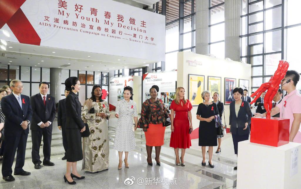 9月5日,国家主席习近平夫人彭丽媛邀请出席金砖国家领导人第九次会晤和新兴市场国家与发展中国家对话会外方代表团团长夫人共同出席“‘美好青春我做主’艾滋病防治宣传校园行——走进厦门大学”活动。