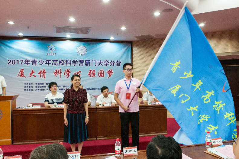 随后,来自平潭第一中学的高芷灵同学作为营员代表发言。福建省青少年科技活动中心侯小慰主任向营员代表授厦门大学分营营旗。与会领导共同启动了2017年青少年高校科学营厦门大学分营。