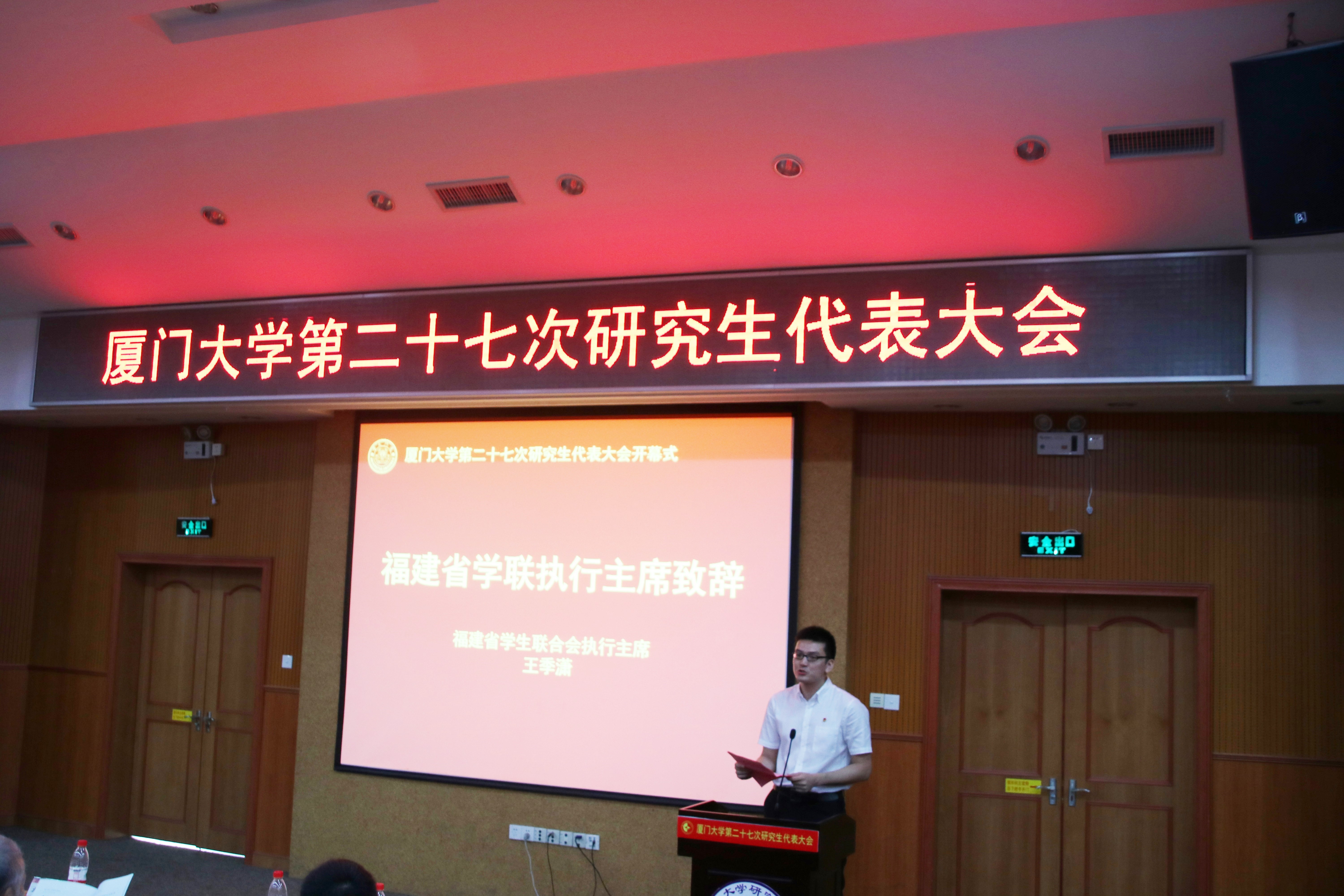 7月9日,我校第二十七次研究生代表大会在思明校区化学报告厅召开。校党委副书记林东伟,校关工委主任陈力文,校关工委常务副主任黄如彬,校关工委副主任郑保东,福建省学生联合会执行主席王季潇,校党委组织部部长梁卫中,校党委宣传部部长徐进功,校党委学生工作部部长夏侯建兵,校党委保卫部部长苏清伟,校团委书记陈怀锋,研究生院综合办副主任王晟及各学院党委、团委负责人出席大会开幕式。