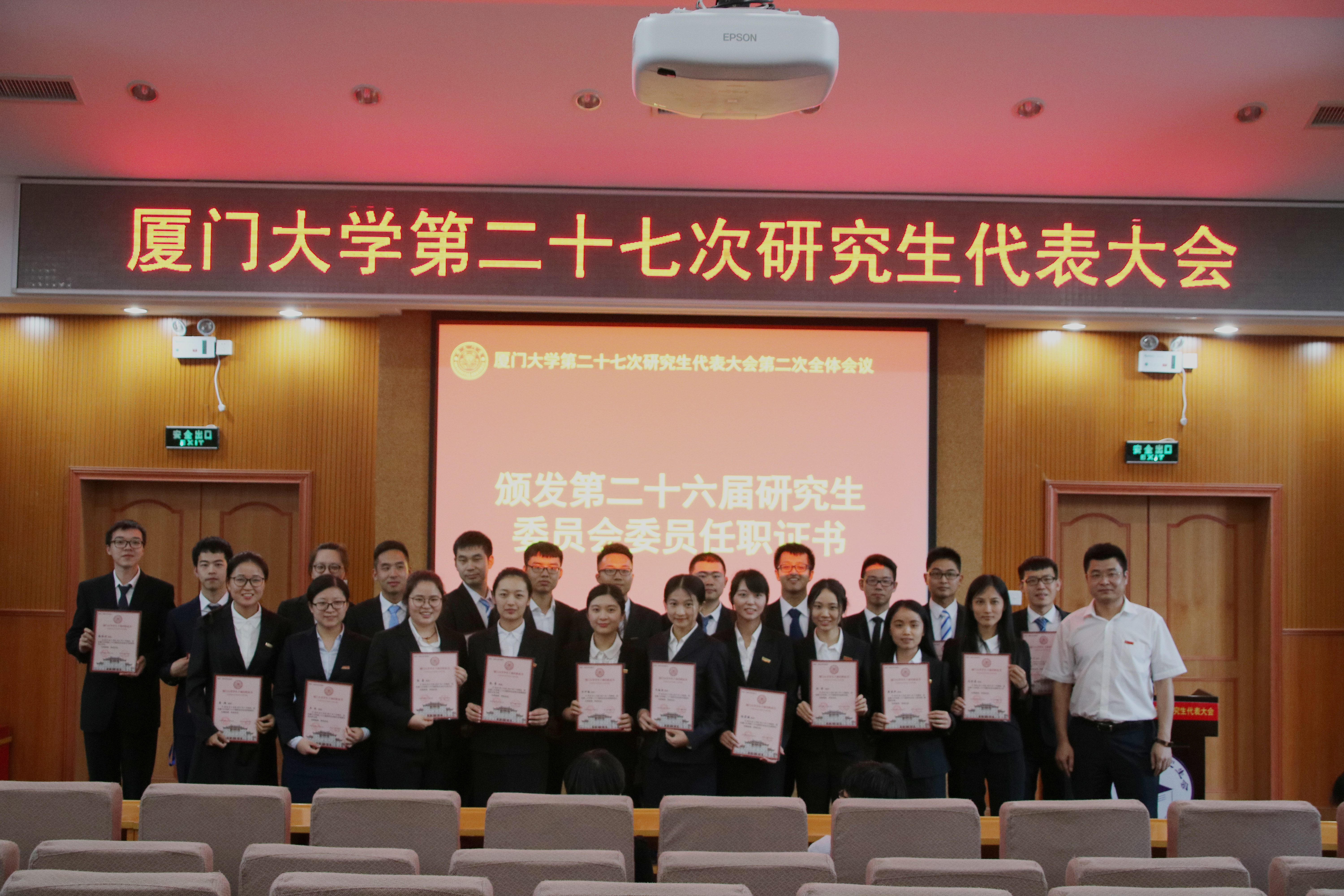 全体代表听取并审议了校研究生会主席黄曦代表第二十六届研究生委员会所做的工作报告,大会通过无记名投票选举产生了厦门大学第二十七届研究生委员会。会上,校团委书记陈怀锋为第二十六届研究生会委员颁发任职资格证书,并为2016-2017学年优秀院研究生会、优秀院研究生会主席颁发荣誉证书,大会在全体代表齐唱校歌中圆满落幕。